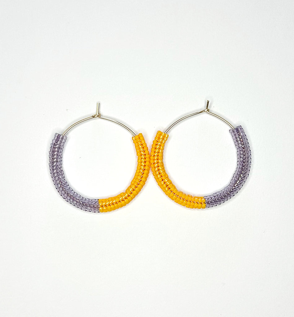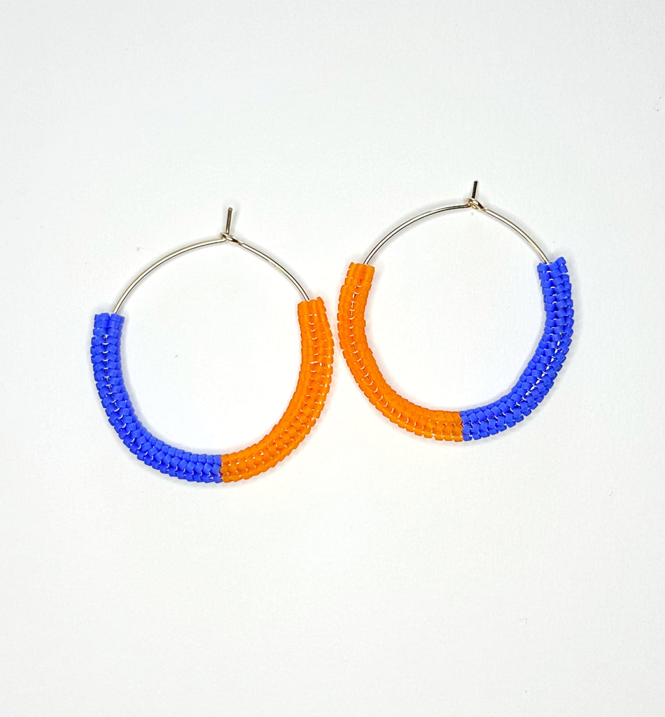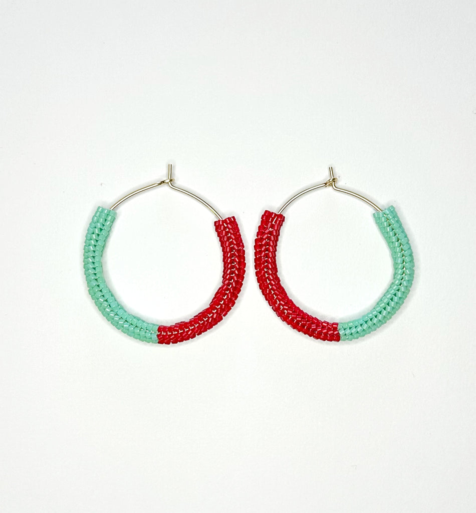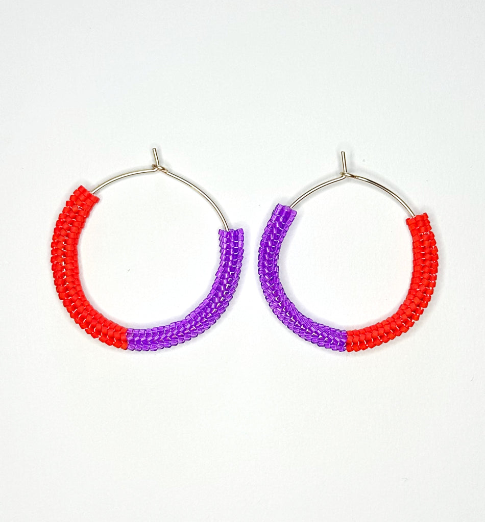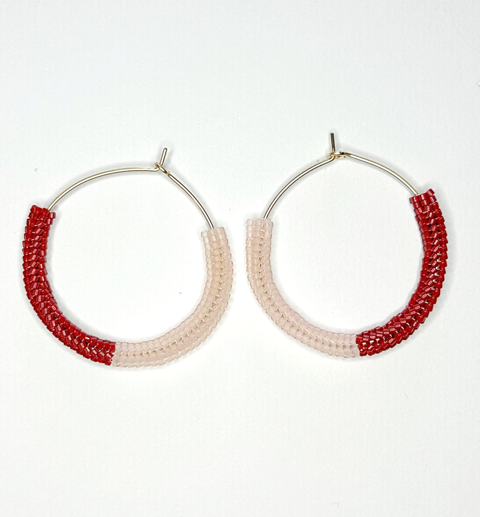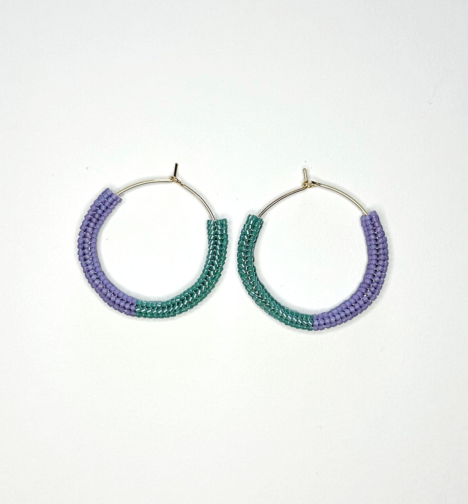 Beaded hoops! Hand hammered gold filled hoops with two color blocking pattern beaded section. Subtle asymmetry with the color order swapped. 1.75" diameter