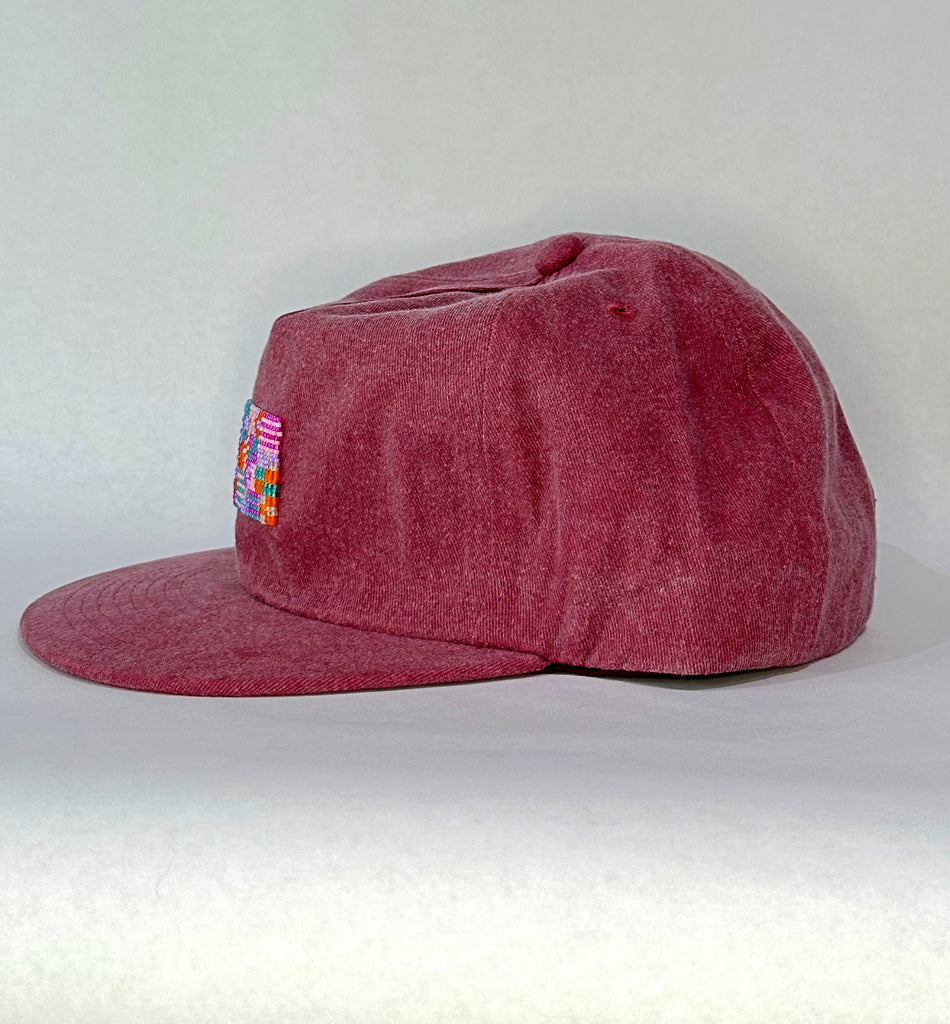 Washed berry cotton flat brim hat blank personalized with a hand beaded quilt pattern patch. Adjustable back band. 100% cotton hat.