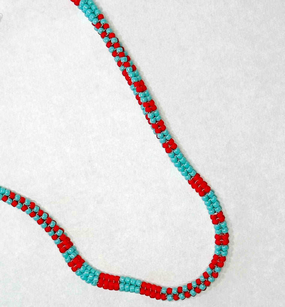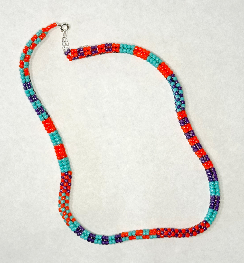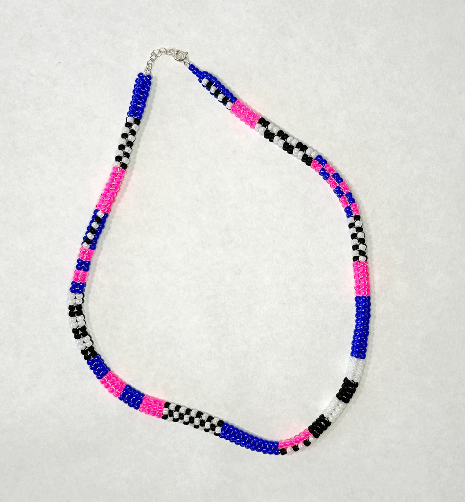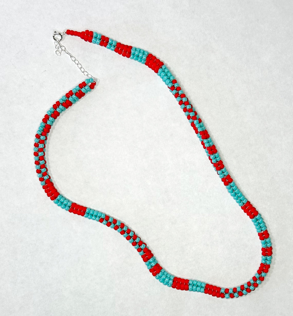 The ever favorite mix patern necklace featuring bigger beads for a bigger statement. Hand beaded with bold colors in a mixed checker pattern. 18" long with 2" of extender chain and sterling silver spring ring clasp.