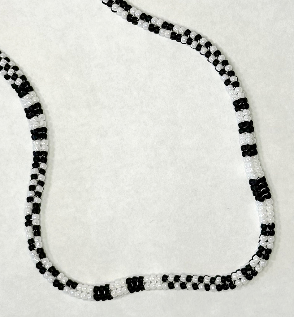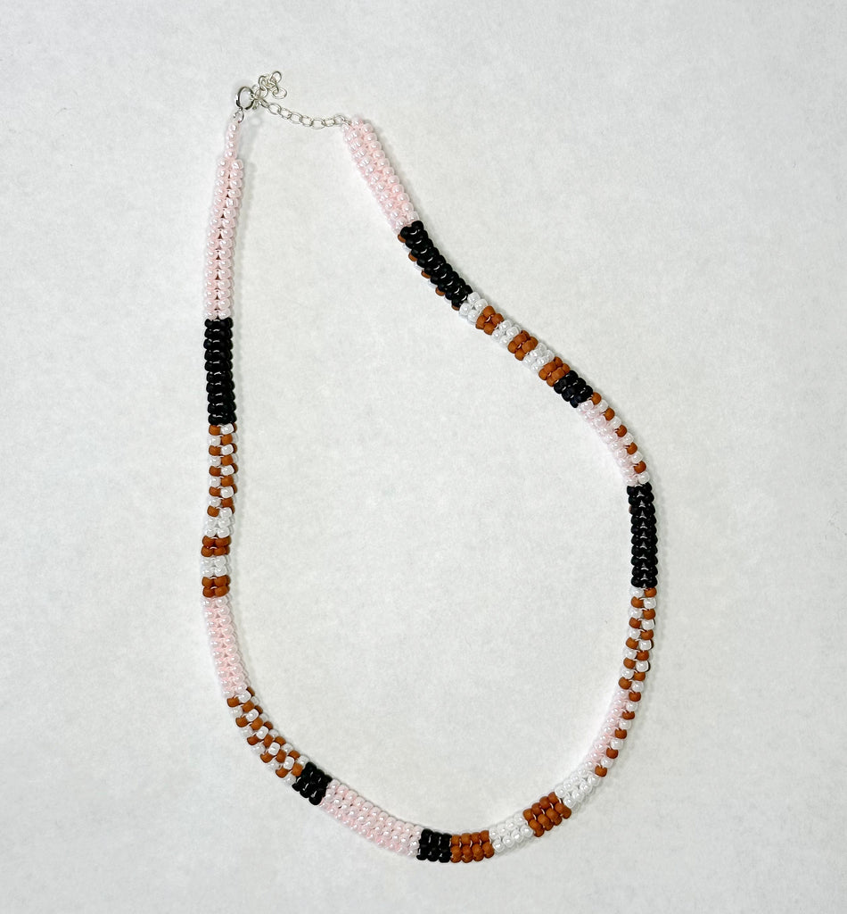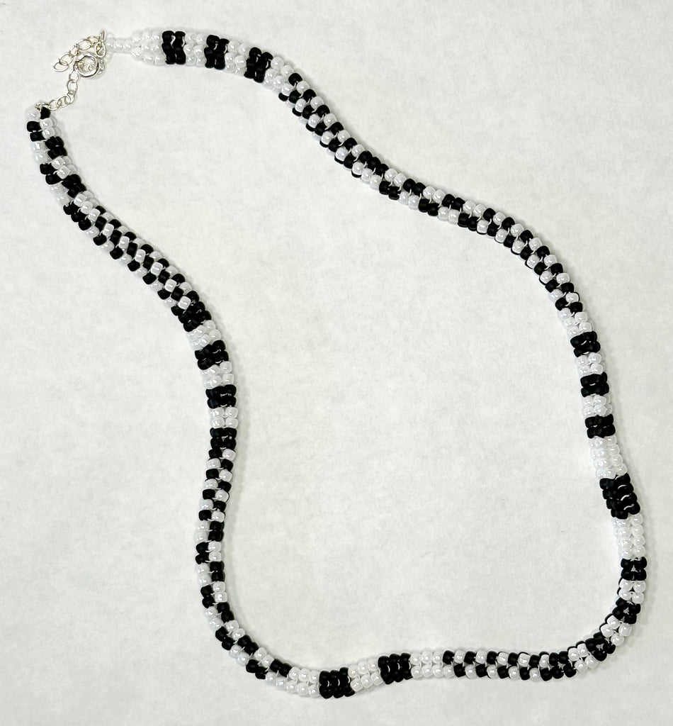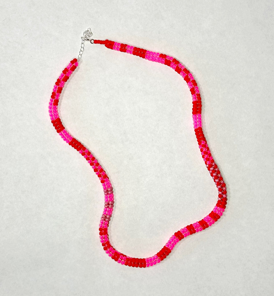 The ever favorite mix patern necklace featuring bigger beads for a bigger statement. Hand beaded with bold colors in a mixed checker pattern. 18" long with 2" of extender chain and sterling silver spring ring clasp.