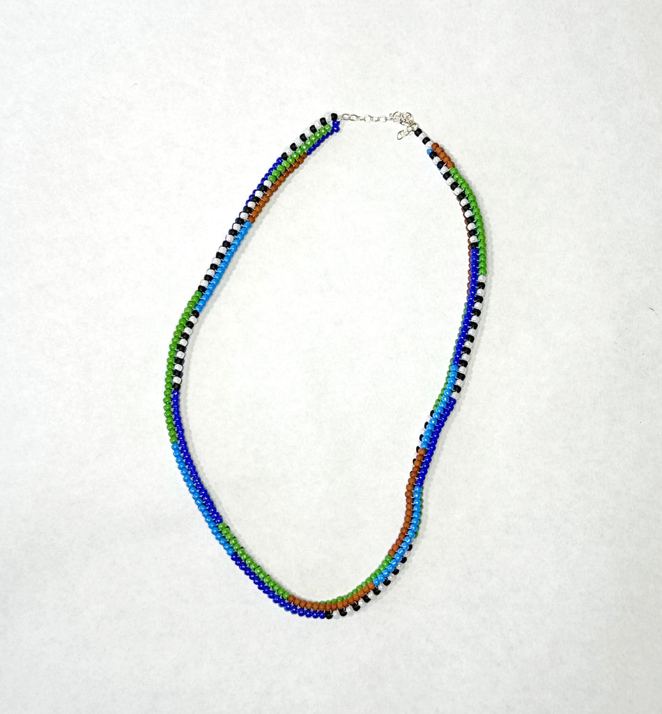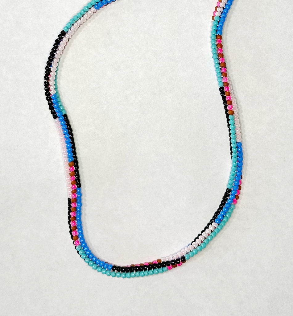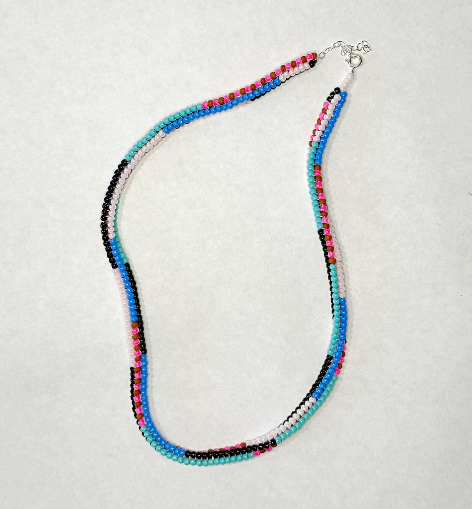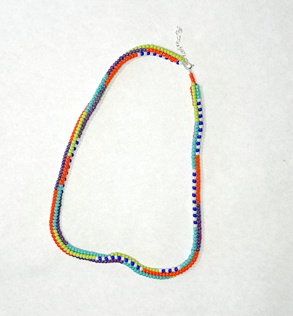 The ever favorite mix stripe necklace featuring bigger beads for a bigger statement.  Hand beaded with bold colors in a mixed stripe pattern. 18" long with 2" of extender chain and sterling silver spring ring clasp.