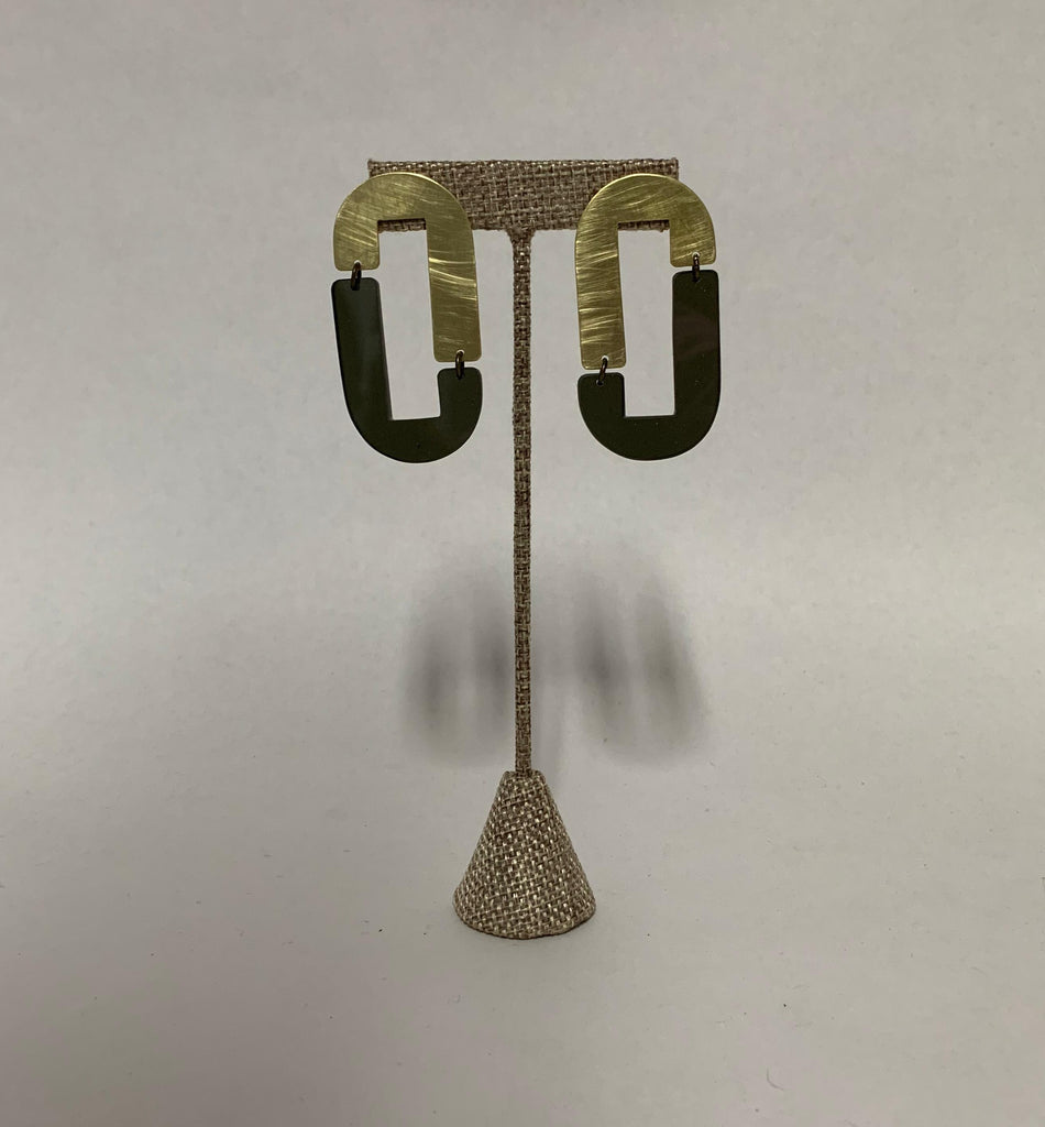 Everyday statement earrings playing with balance and movement. Brushed brass and acrylic with sterling silver posts. Total length 2.25".
