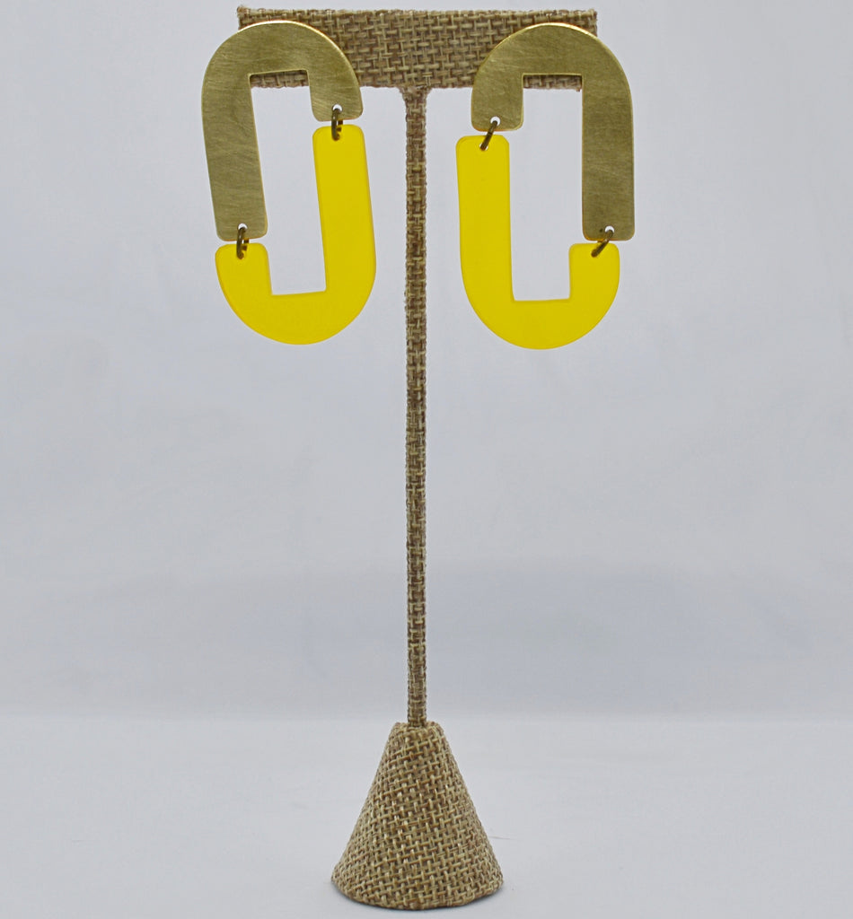 Everyday statement earrings playing with balance and movement. Brushed brass and acrylic with sterling silver posts. Total length 2.25".