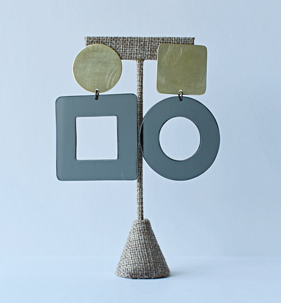 Big sister to the Sausalito earrings, these City earrings are sure to grab attention. Simple shapes playing with asymmetry and negative space. Brushed brass and acrylic with sterling silver posts. Total length 3".