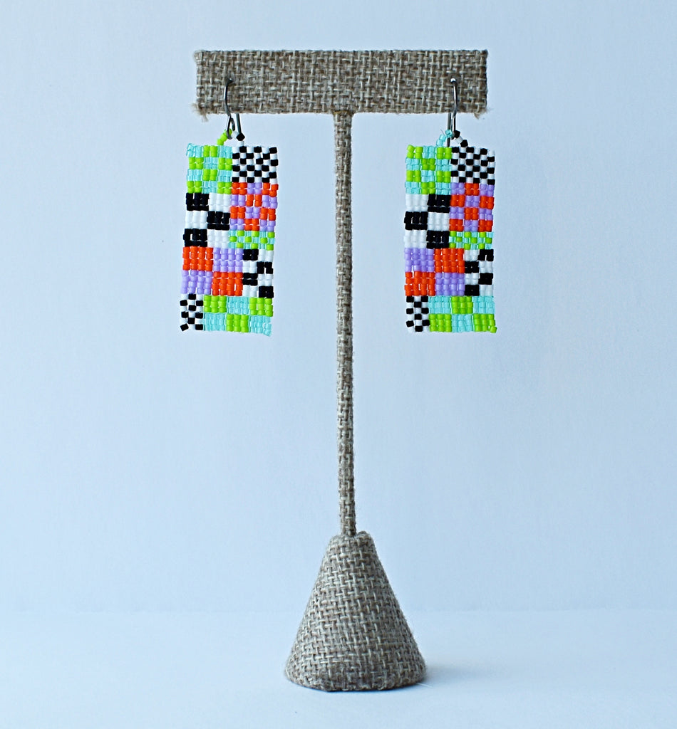 A mini version the popular memphis earrings! Beaded earrings with mixed checkered pattern inspired by Memphis design on niobium (hypoallergenic) ear wires. Black, white, purple, orange, lime green and turquoise colored beads. Total length including ear wires is 2". Check out all the fun color variations and don't hesitate to reach out if you'd like a custom colorway.