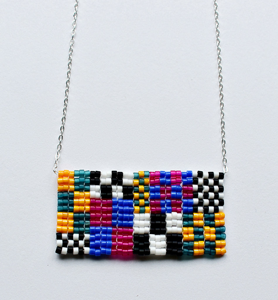 Beaded and chain necklace with checkerboard pattern centerpiece. Mango orange, deep teal, black, white, magenta and blue woven bead pendant section measures 1.5" wide and .75" tall. 19" total length on sterling silver cable chain with spring ring closure.