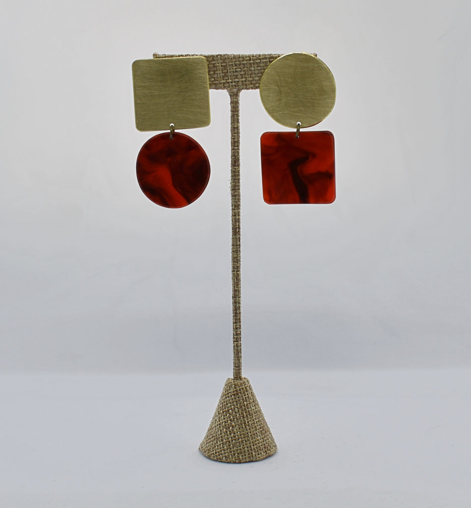 Simple everyday earrings playing with asymmetry. Brushed brass and acrylic with sterling silver posts. Total length 2.5".