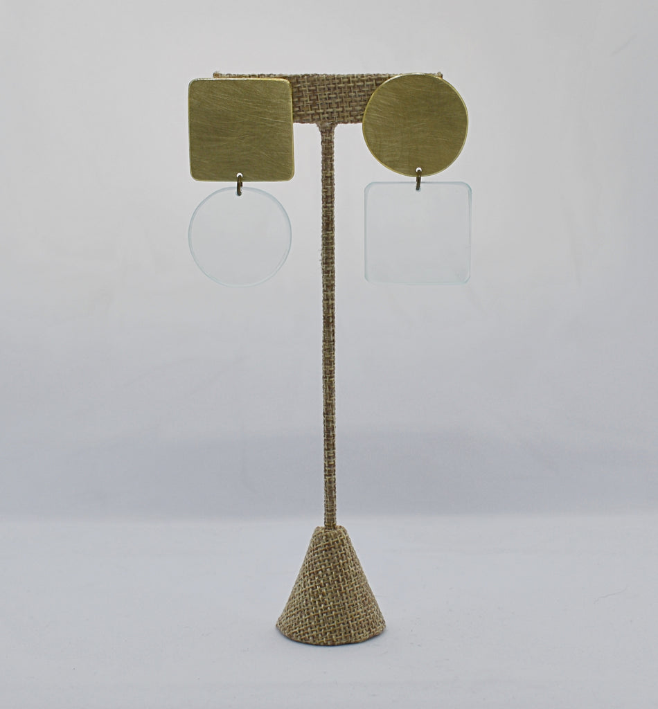 Simple everyday earrings playing with asymmetry. Brushed brass and acrylic with sterling silver posts. Total length 2.5".