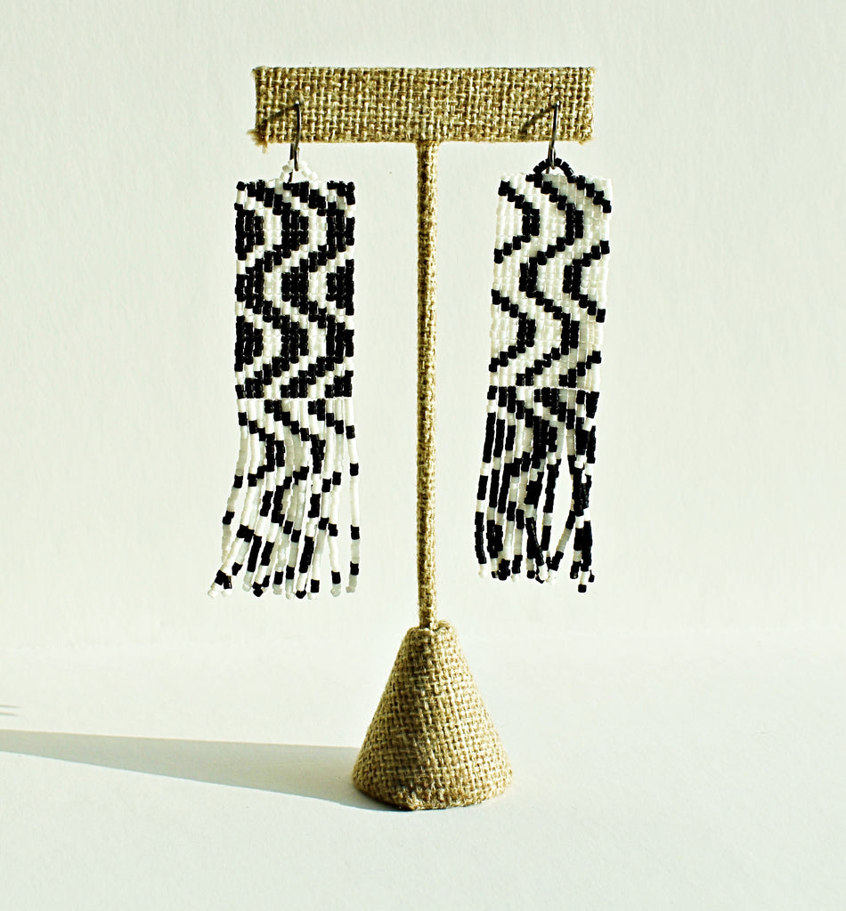 Fringe beaded earrings on niobium (hypoallergenic) ear wires. Black and white colored beads. Total length including ear wires is 3.75".