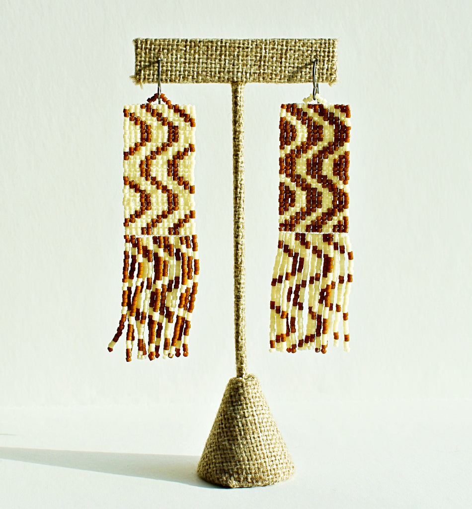 Fringe beaded earrings on niobium (hypoallergenic) ear wires. Creme and brown colored beads. Total length including ear wires is 3.75".