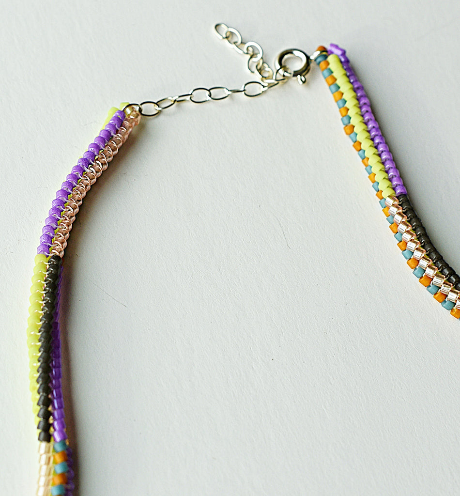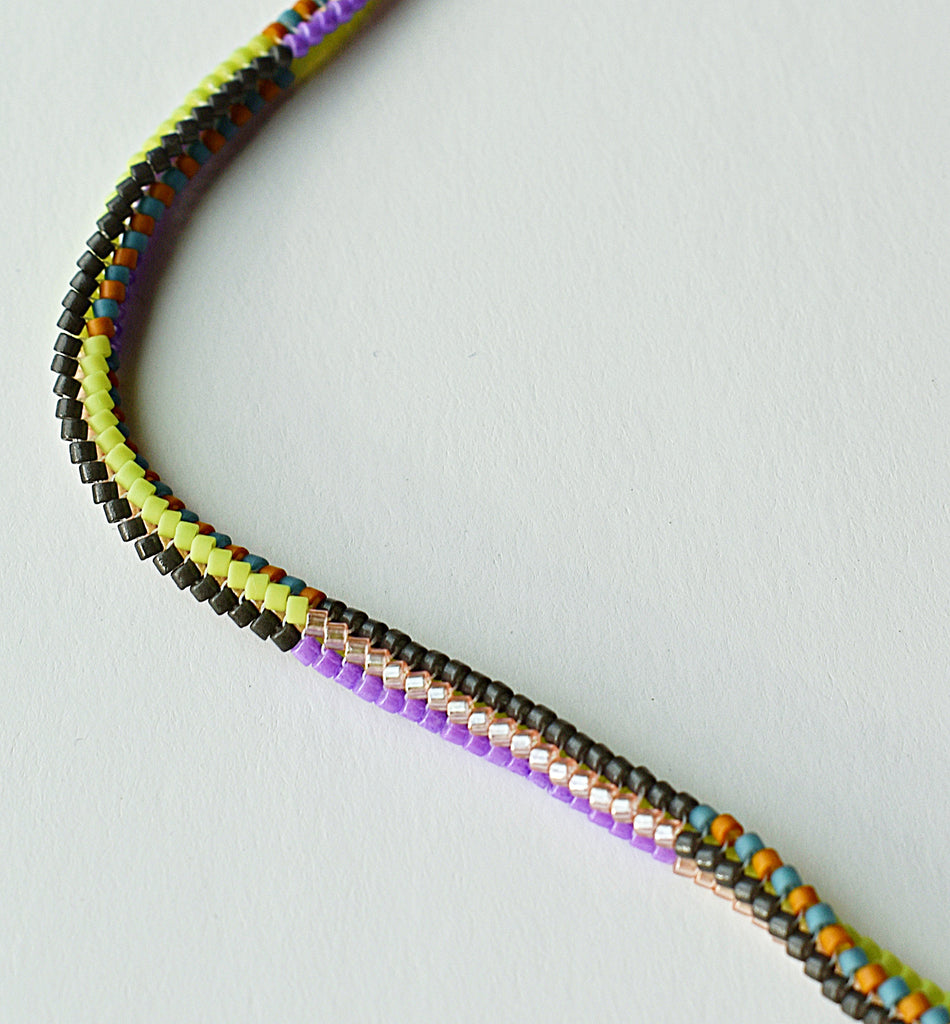 Narrow beaded rope necklace in varying stripes pattern. 15" long with sterling silver spring ring clasp closure and 2" of adjustable sterling silver chain. Grey, kiwi green, bright purple, soft pink, ochre and teal blue colored beads.