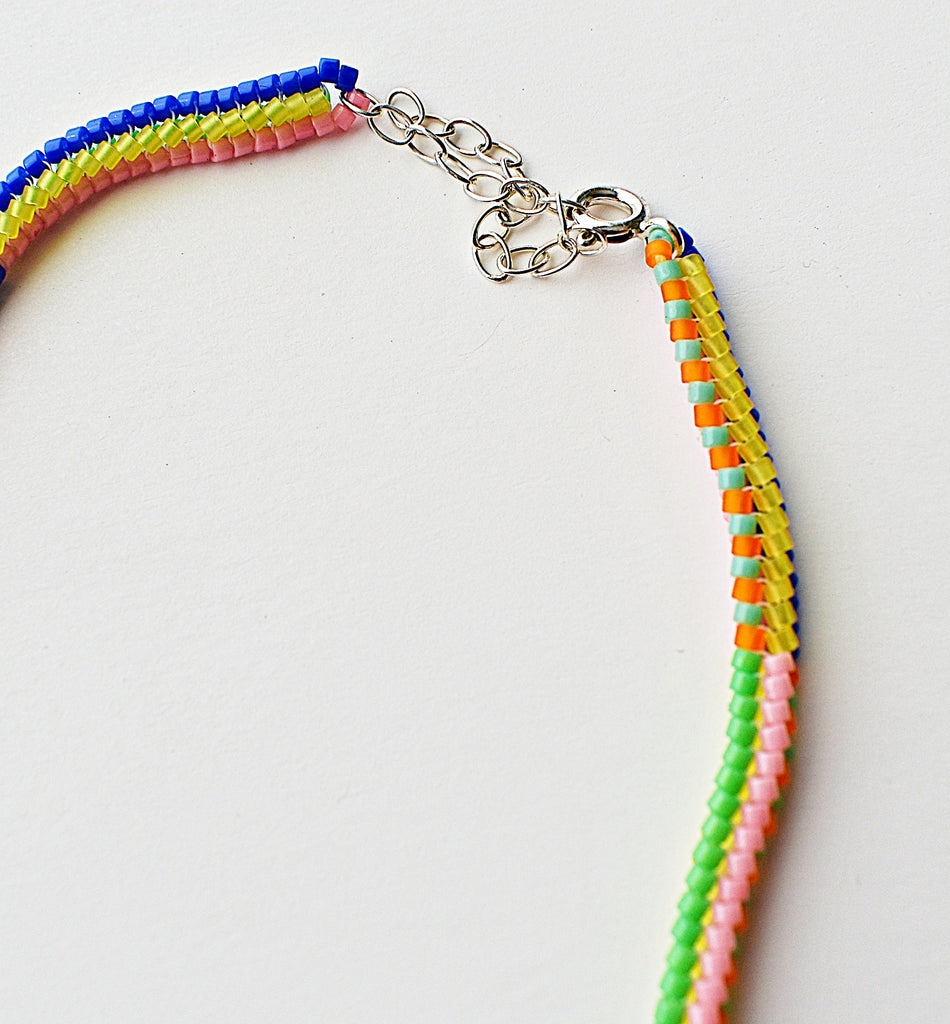 Narrow beaded rope necklace in varying stripes pattern. 15" long with sterling silver spring ring clasp closure and 2" of adjustable sterling silver chain. Kiwi green, orange, aqua, yellow, bubblegum pink and blue colored beads.