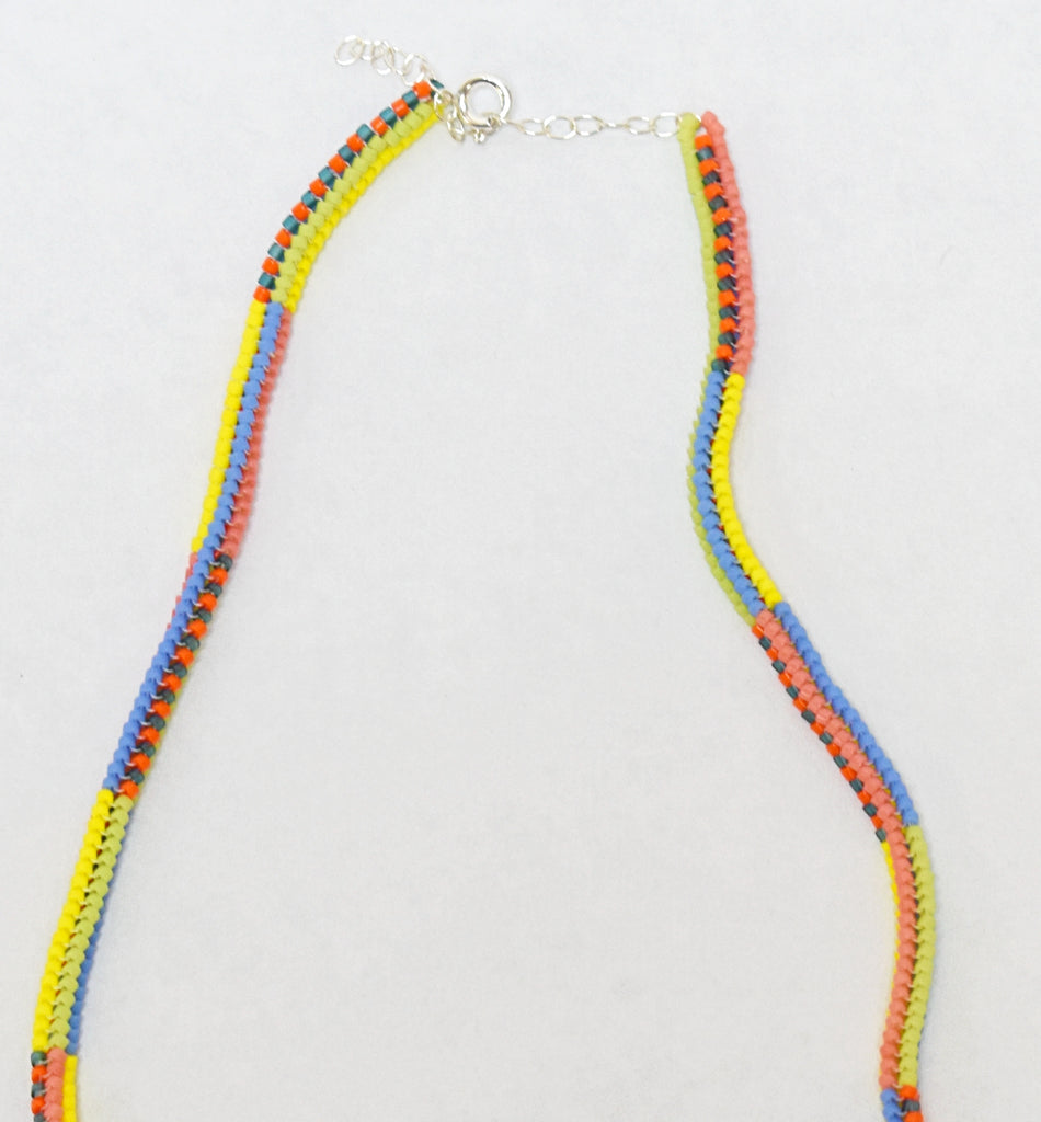 Narrow beaded rope necklace in varying stripes pattern. 15" long with sterling silver spring ring clasp closure and 2" of adjustable sterling silver chain. Yellow, grapefruit pink, sky blue, lime green, orange and teal colored beads.