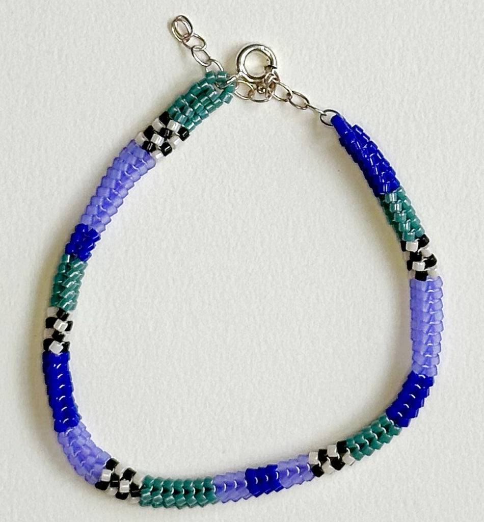 Blues: block and checker pattern with black, white, sea green, blue and purple colored beads