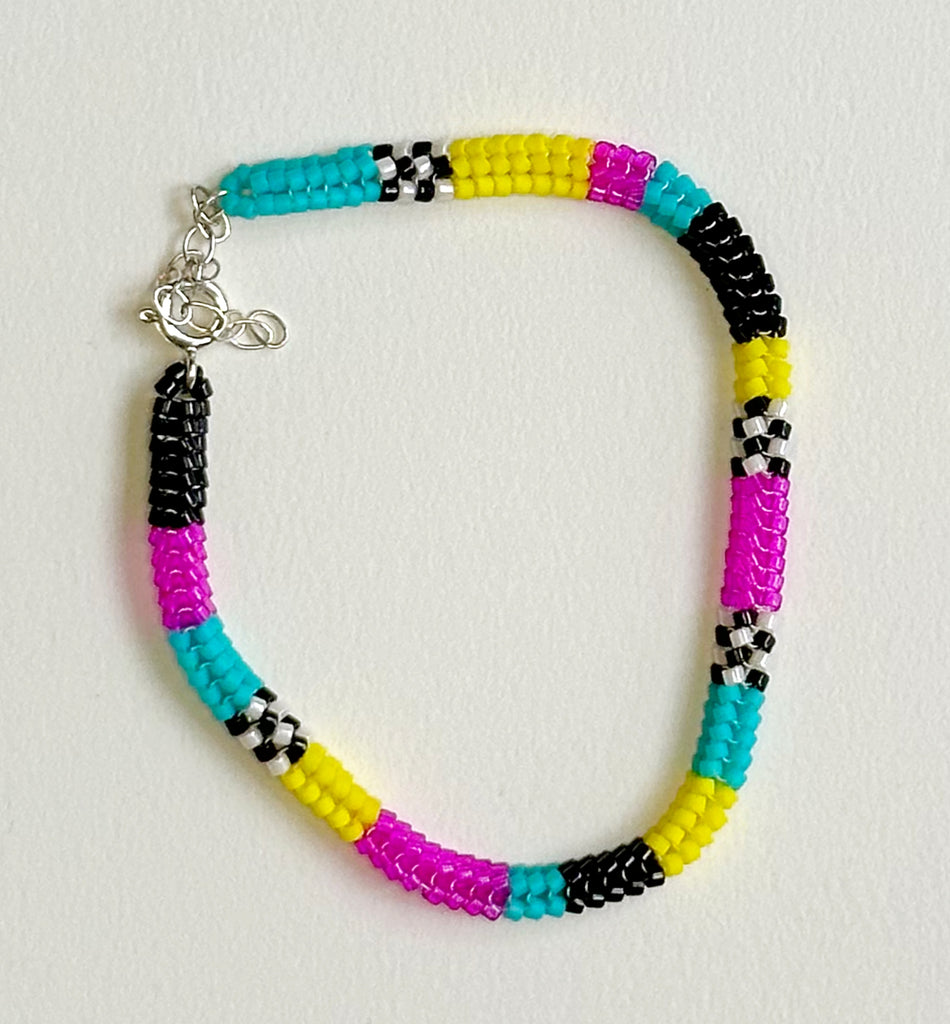90s: block and checker pattern with black, white, yellow, turquoise and magenta colored beads