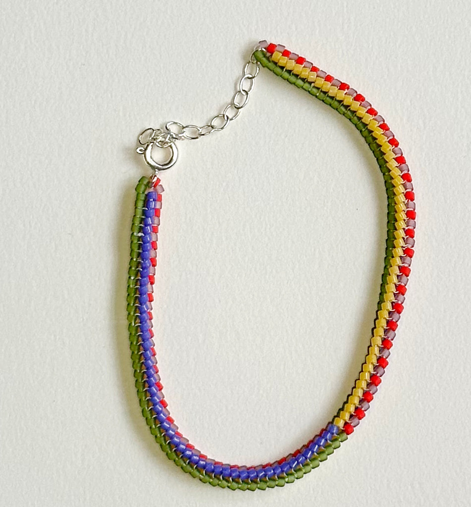 Floral: stripes pattern with yellow, green, purple, mauve and paprika colored beads