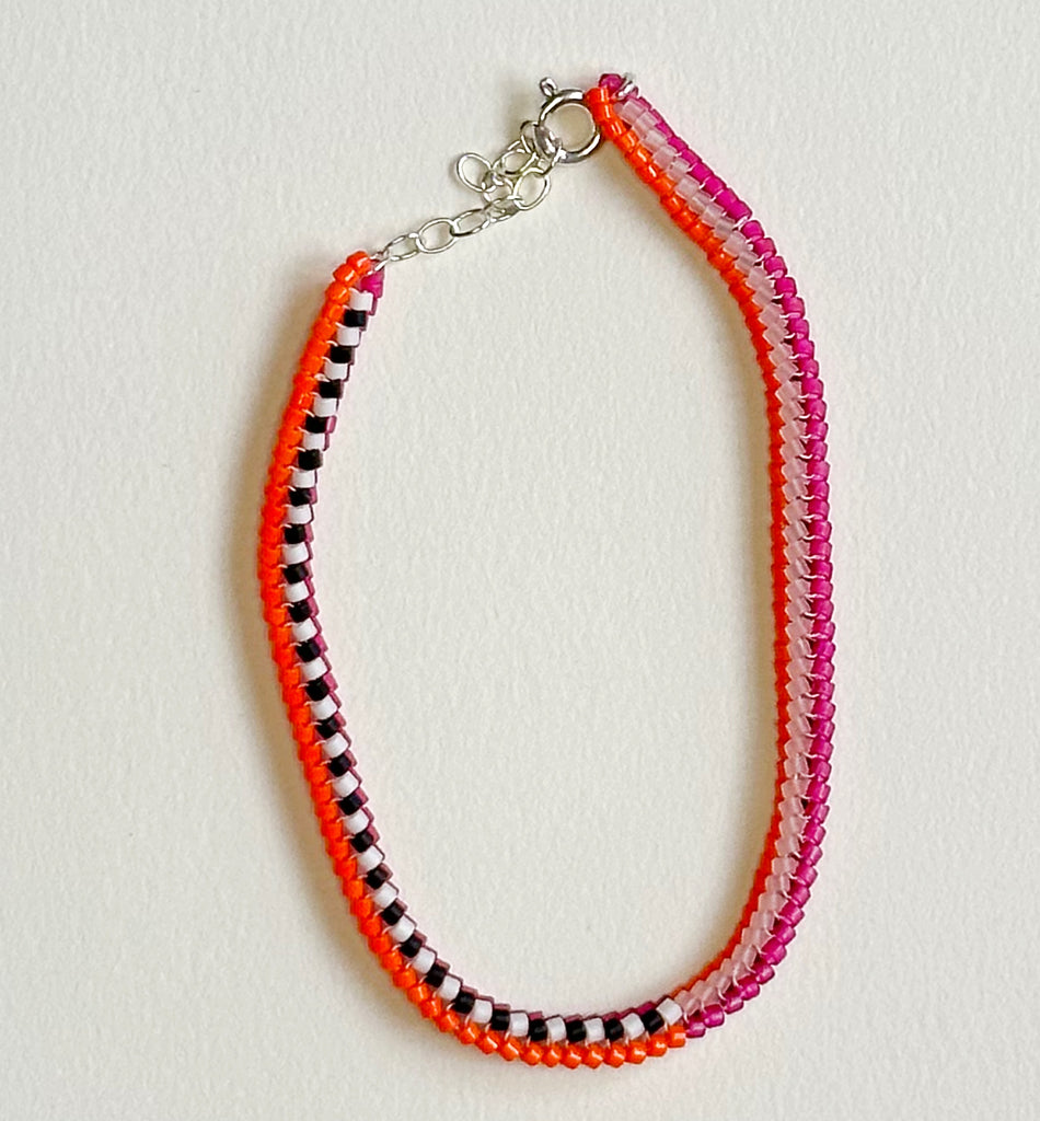 Reds: stripes pattern with black, white, paprika, magenta and light pink colored beads