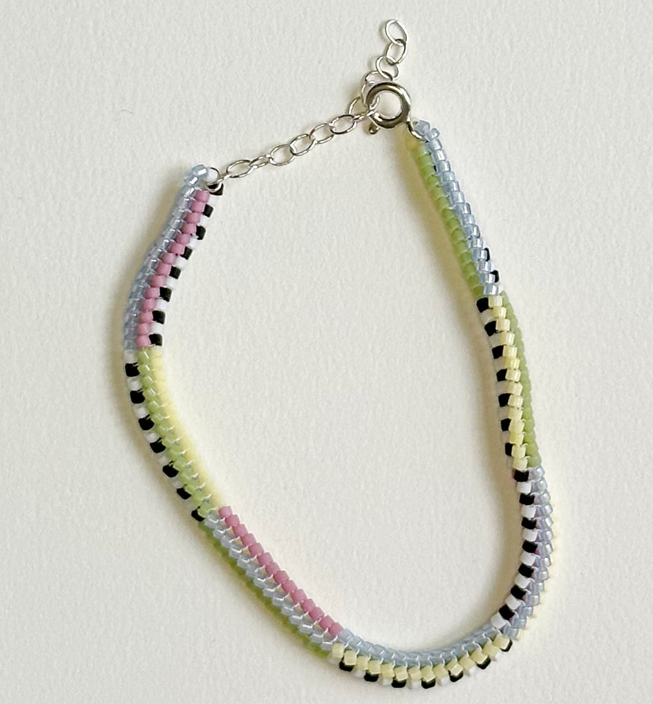 Pastel: stripe pattern with black, white, yellow, mauve, sage green and light blue colored beads