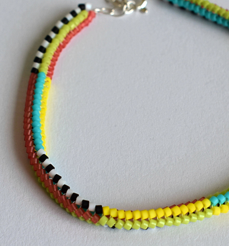 Beaded rope bracelet in mixed stripe pattern with adjustable sterling silver chain and sterling silver spring ring clasp. Brown, green, yellow, aqua, black, and white colored beads. 6" in length with 1.5" chain adjuster.