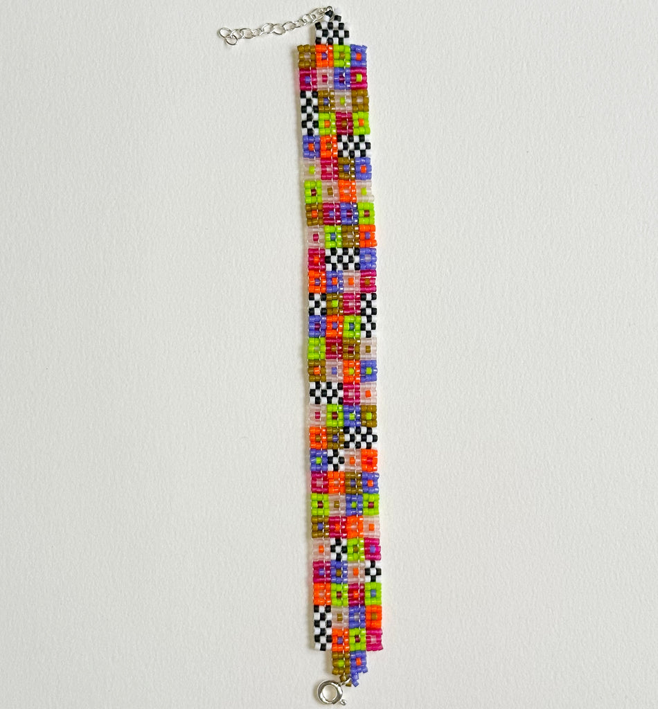 Neon Squares: checker and stripe pattern with black, white, olive, orange, purple, lime green, magenta and light pink colored beads