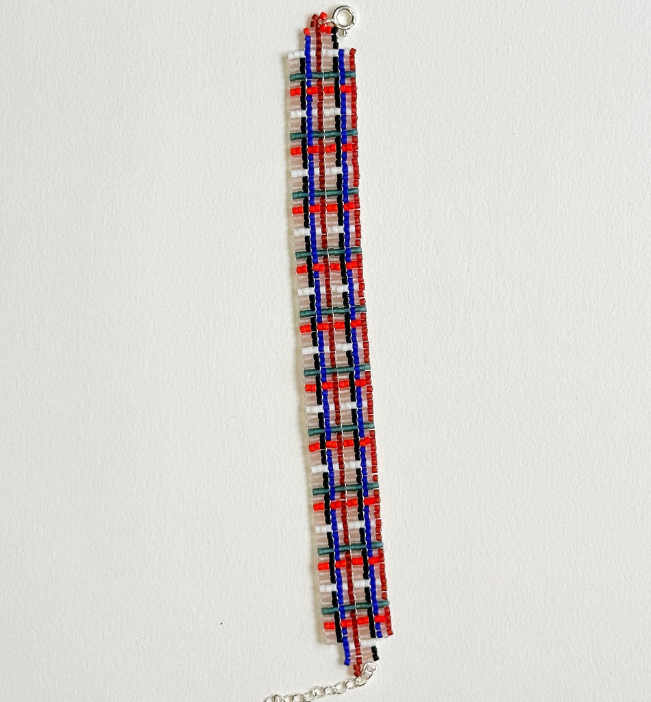 Red Plaid: checker and stripe pattern with black, white, light pink, aqua, red and blue colored beads.