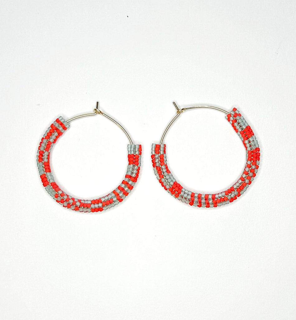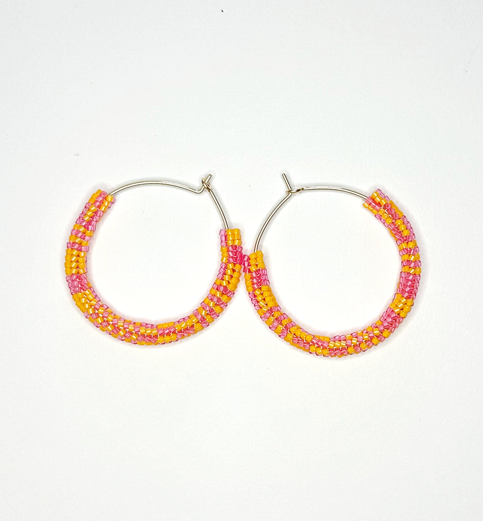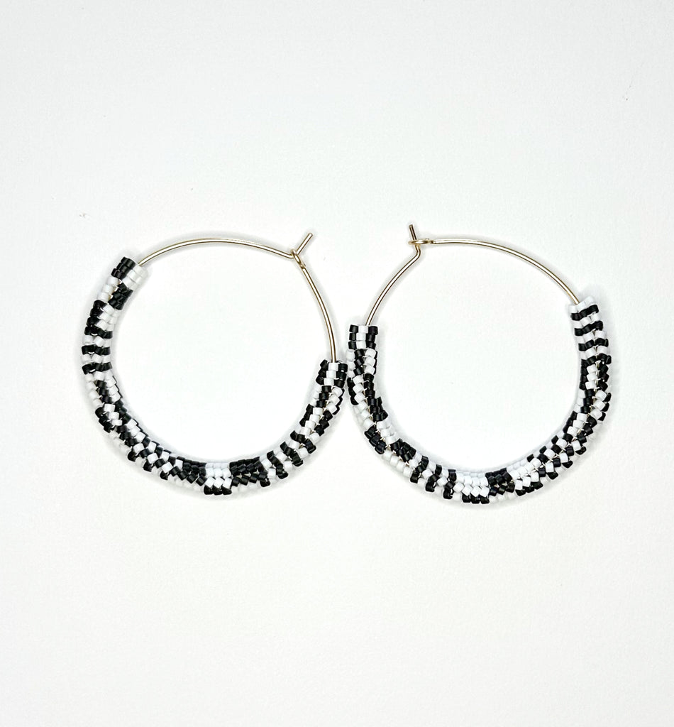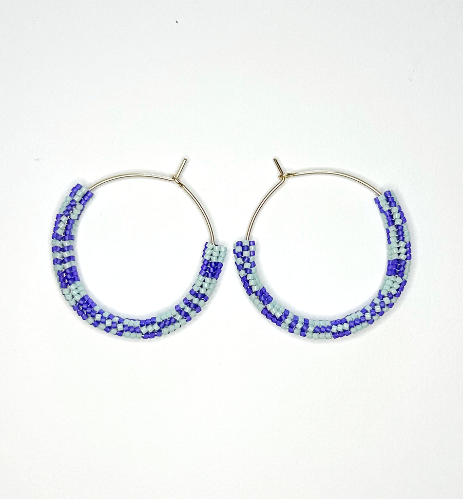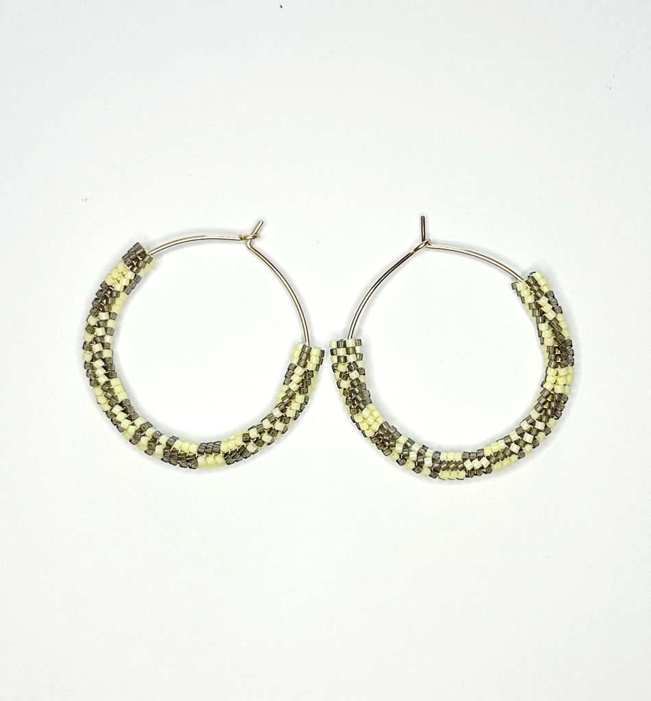 Beaded hoops! Hand hammered gold filled hoops with mixed pattern beaded section. Subtle asymmetry with the color order swapped. 1.75" diameter