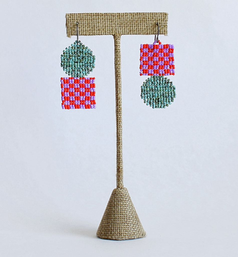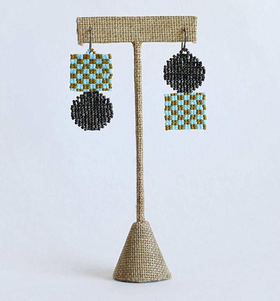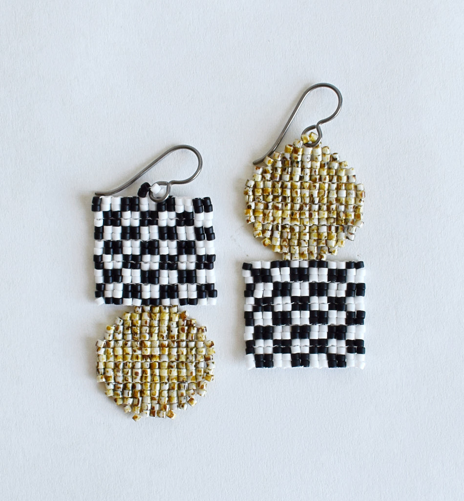 A beaded version of the favorite Sausalito earrings with a fun checkerboard and picasso bead update! Beaded earrings in square and circle shapes on niobium (hypoallergenic) ear wires. Total length including ear wires is 2". Japanese glass seed beads.