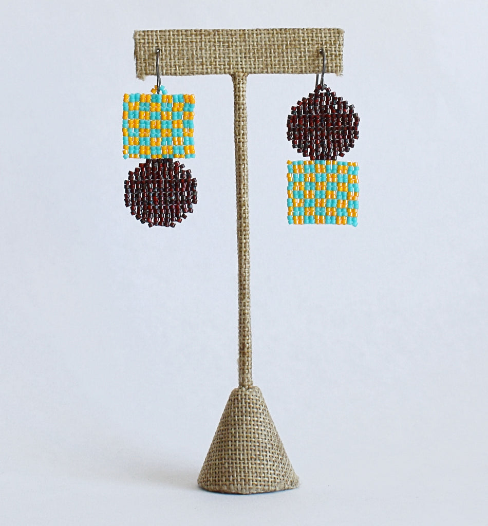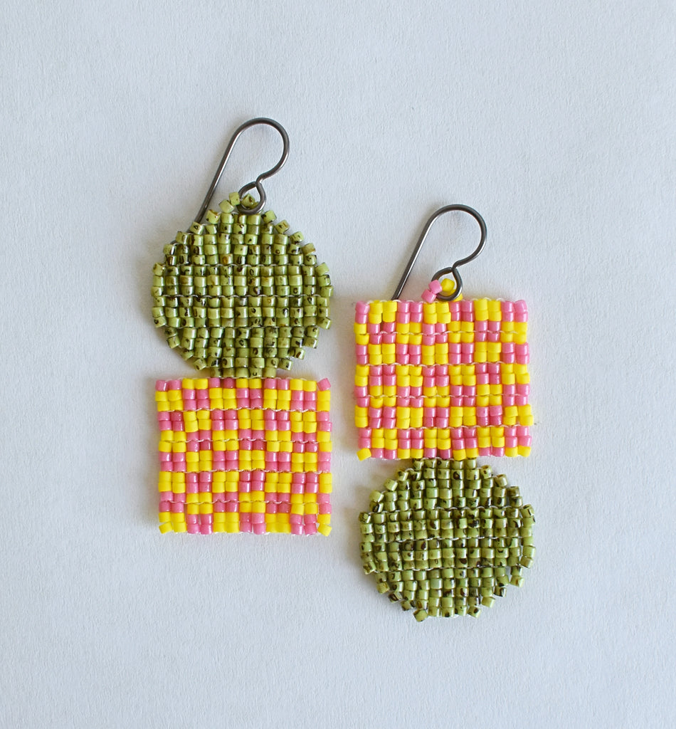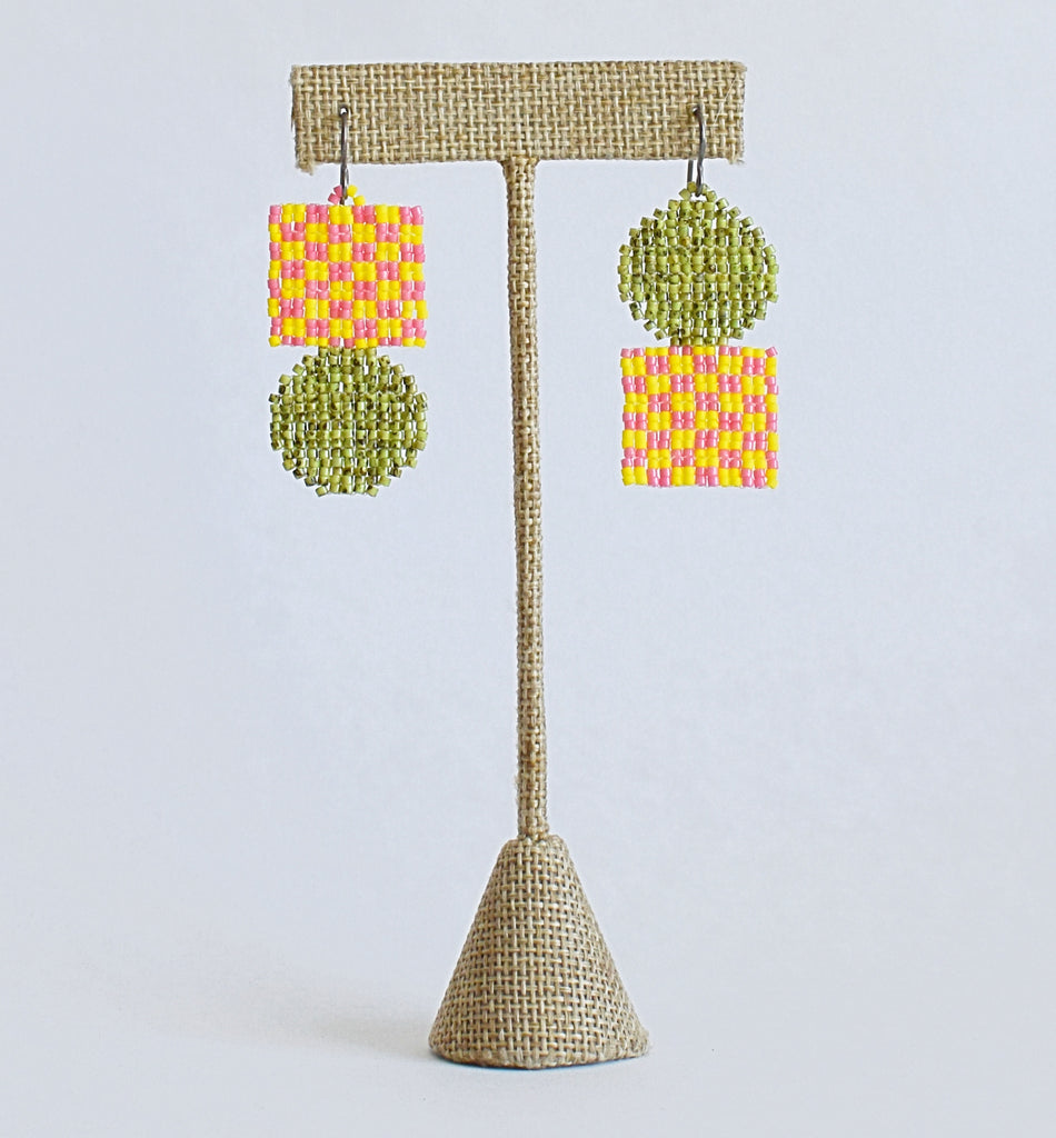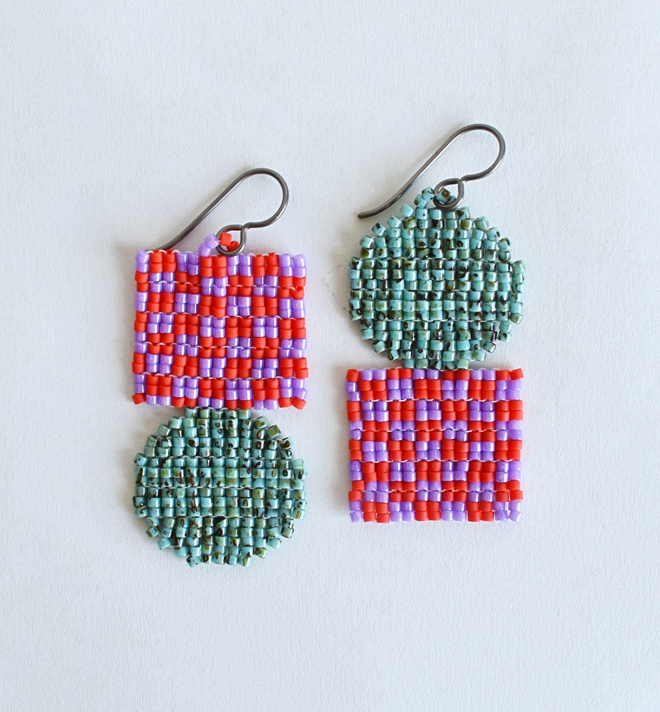 A beaded version of the favorite Sausalito earrings with a fun checkerboard and picasso bead update! Beaded earrings in square and circle shapes on niobium (hypoallergenic) ear wires. Total length including ear wires is 2". Japanese glass seed beads.