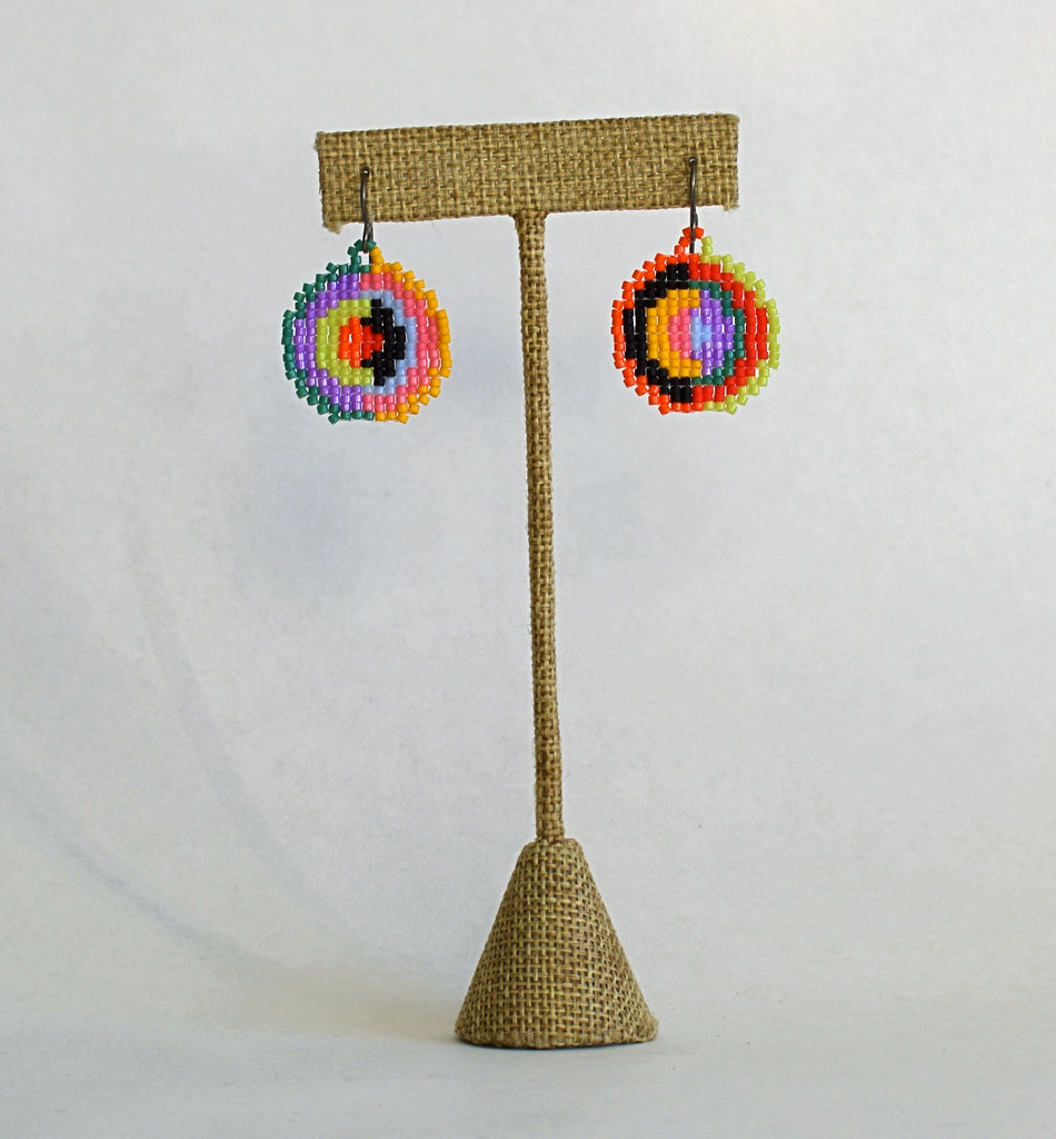 Colorful circle beaded earrings on niobium (hypoallergenic) ear wires. Green, purple, lime green, orange, paprika, black, sky blue, pink and mango colored beads. Total length including ear wires is 1.5".