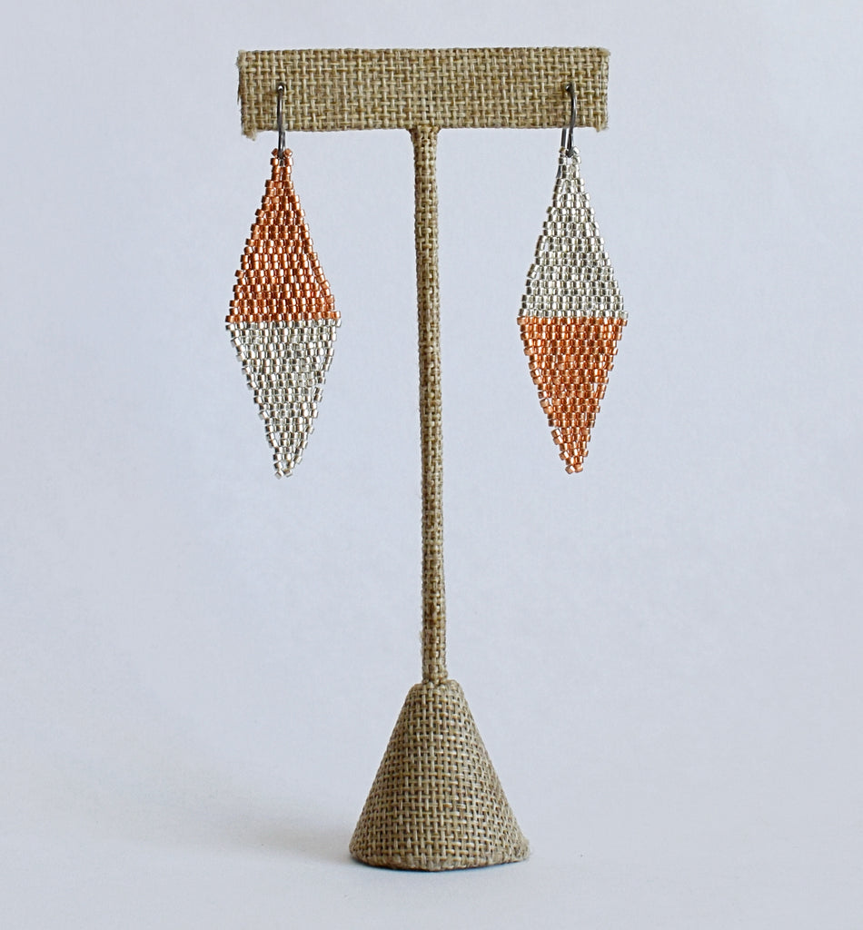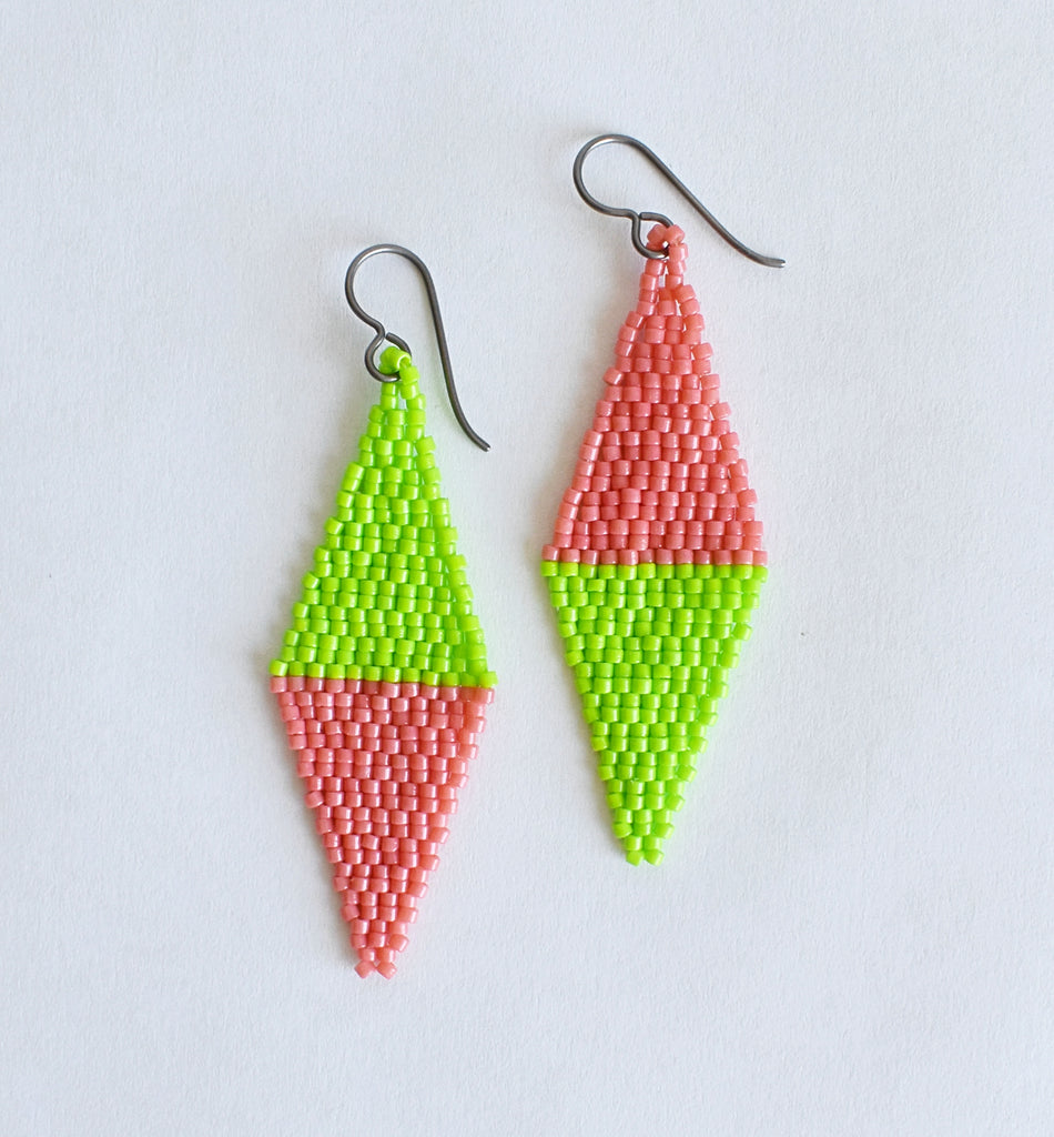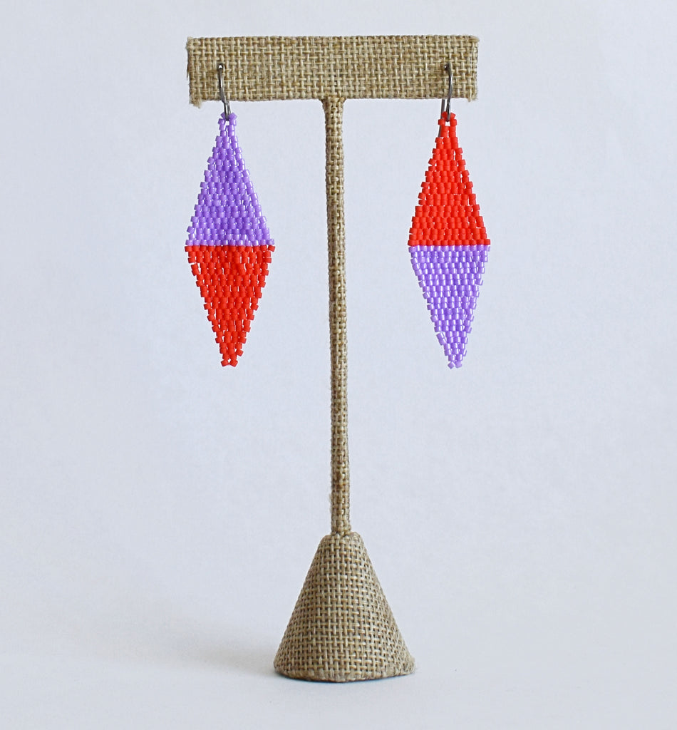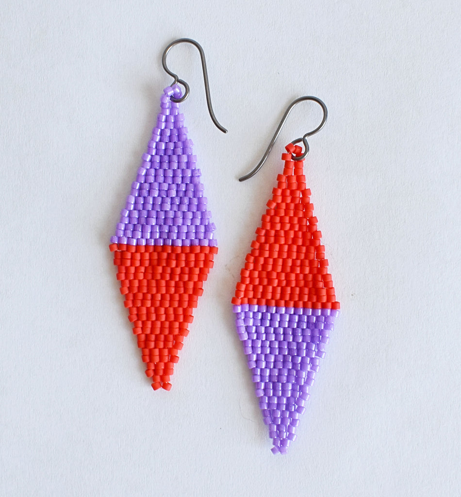Hand beaded earrings in a diamond shape with bold color combinations. Hypoallergenic ear wires (niobium) are great for sensitive ears. 2.75" total length including the ear wire. Japanese glass seed beads.