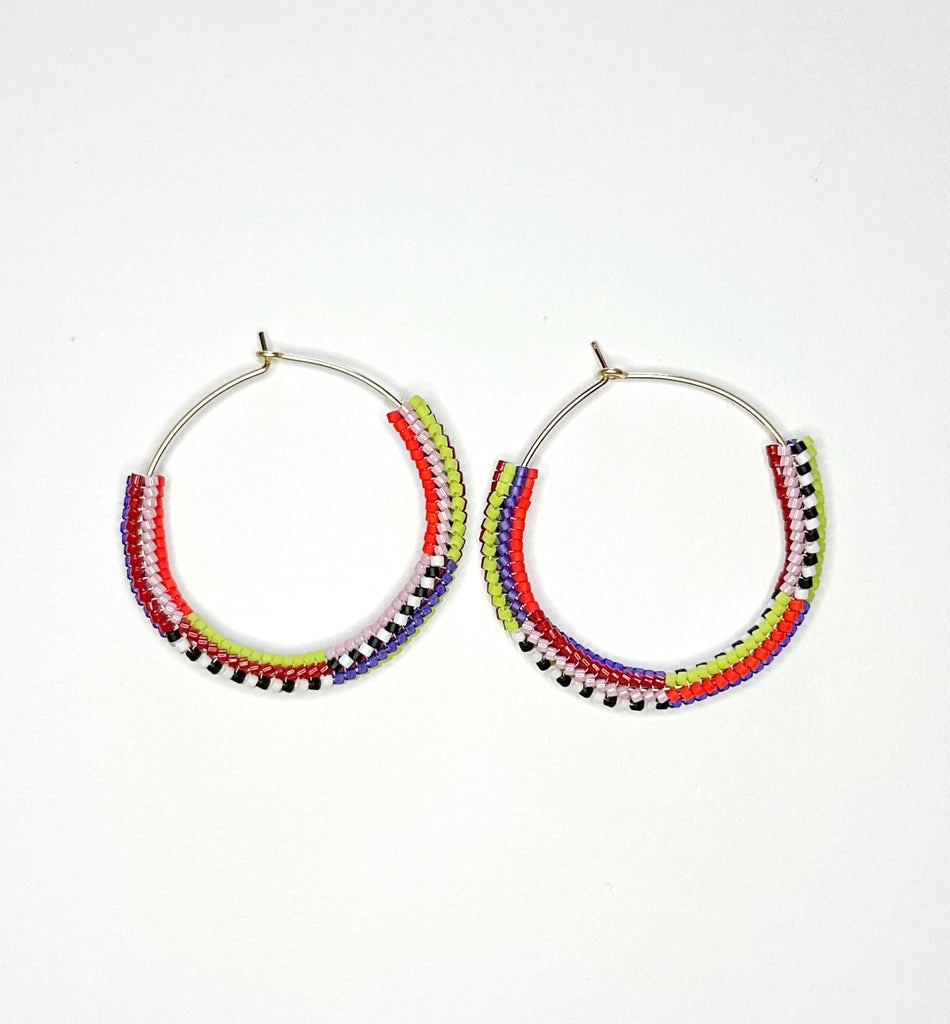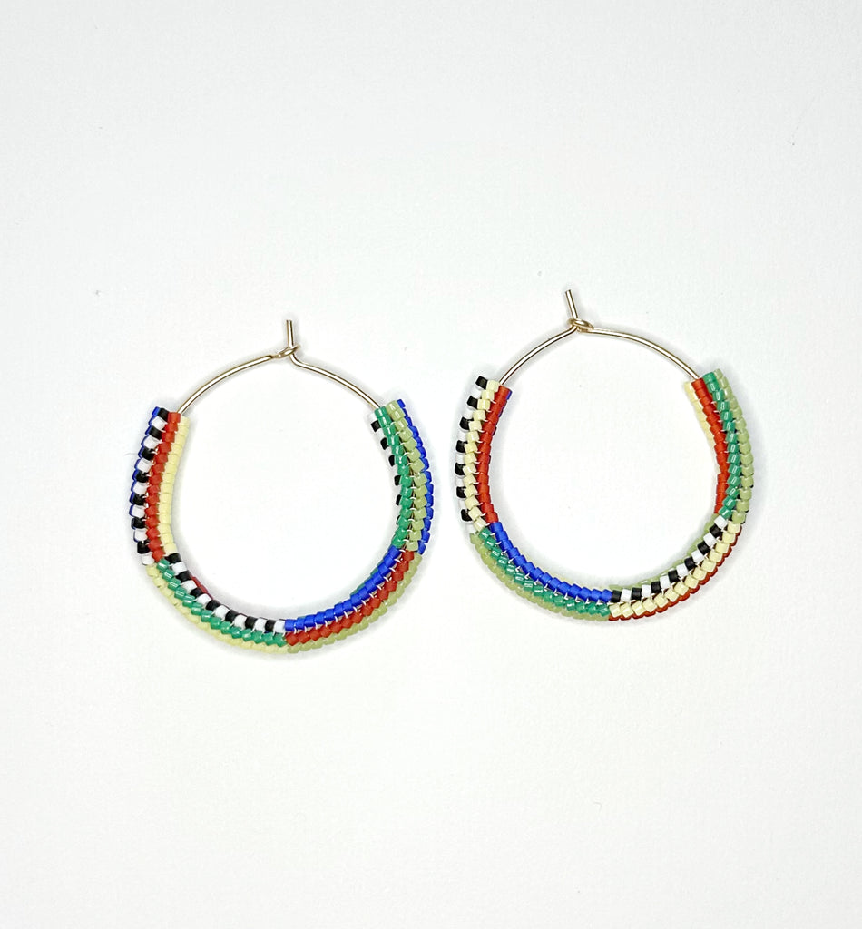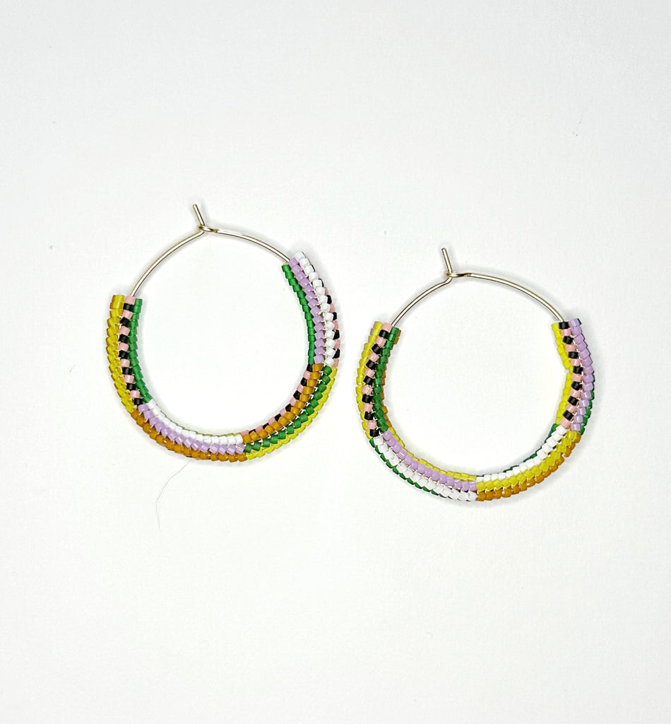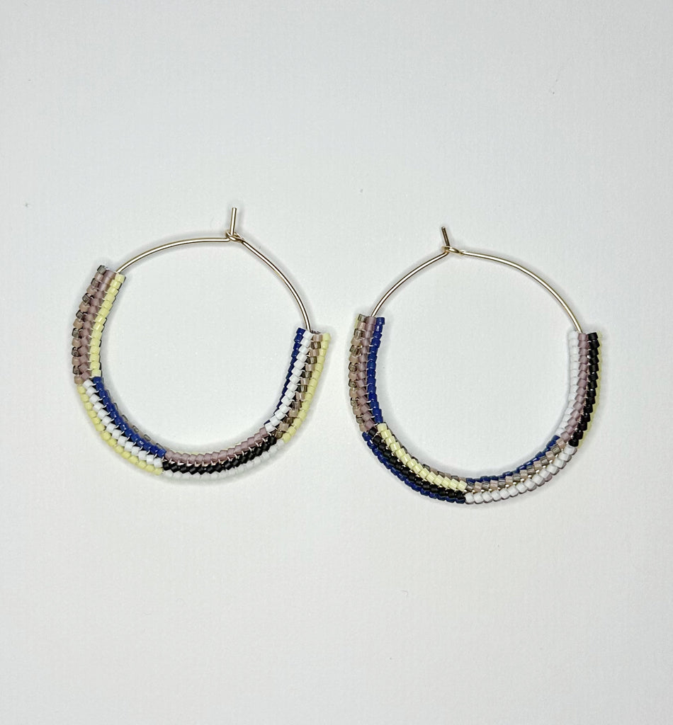 Beaded hoops! Hand hammered gold filled hoops with mixed stripe pattern beaded section. Subtle asymmetry with the color order swapped. 1.75" diameter