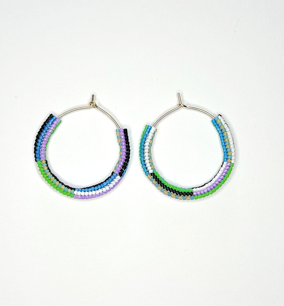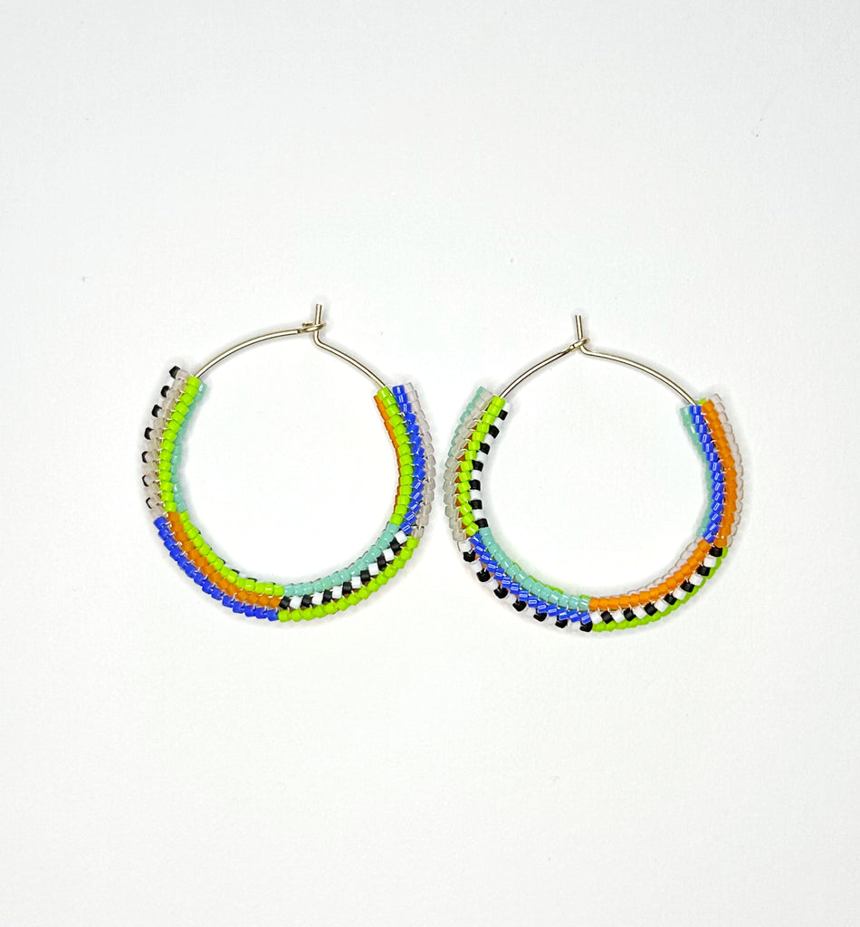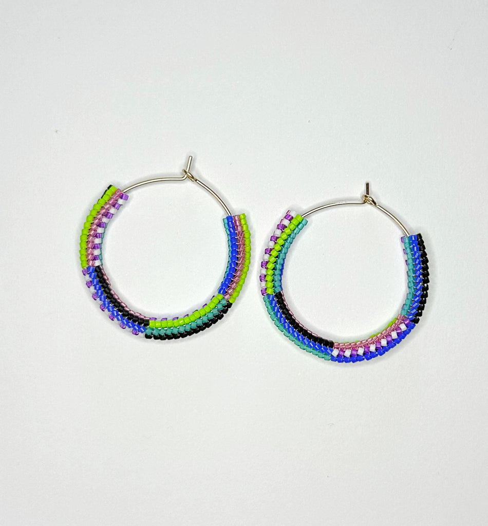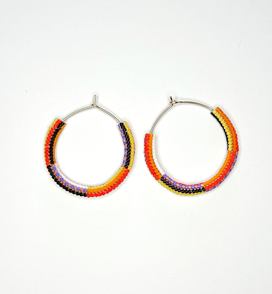 Beaded hoops! Hand hammered gold filled hoops with mixed stripe pattern beaded section. Subtle asymmetry with the color order swapped. 1.75" diameter