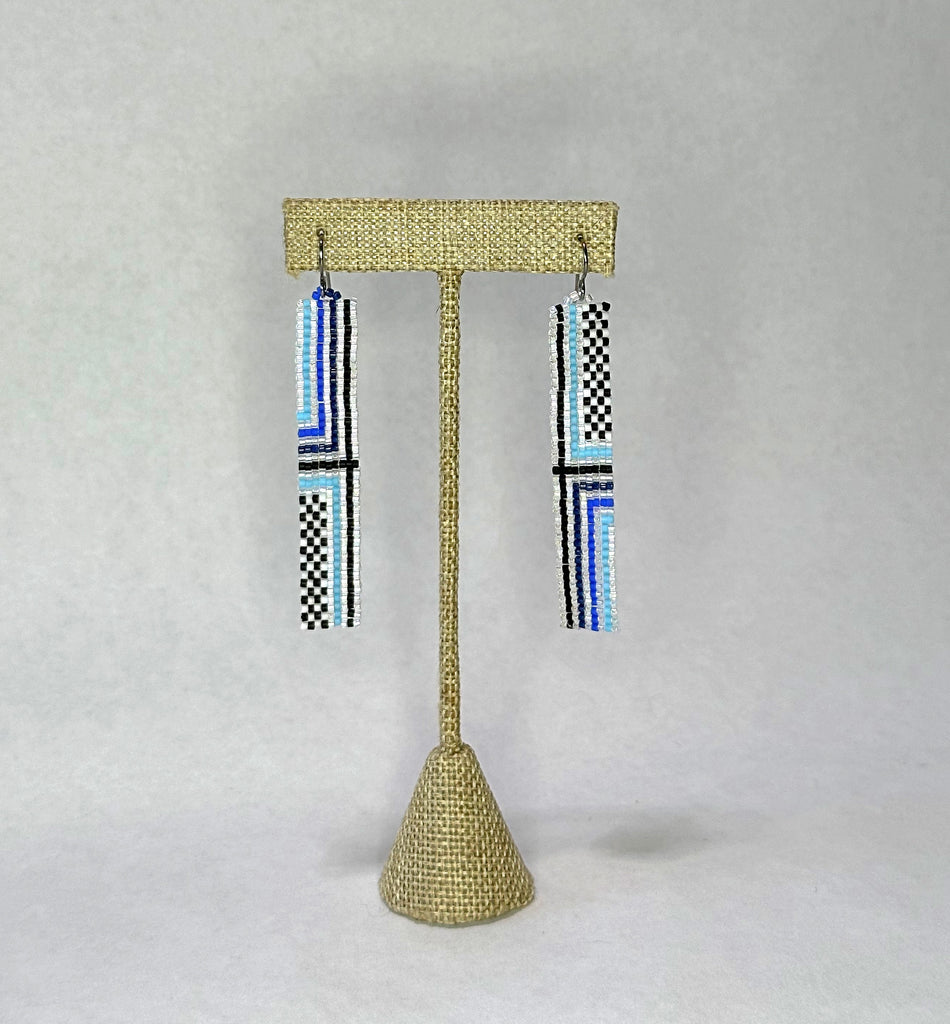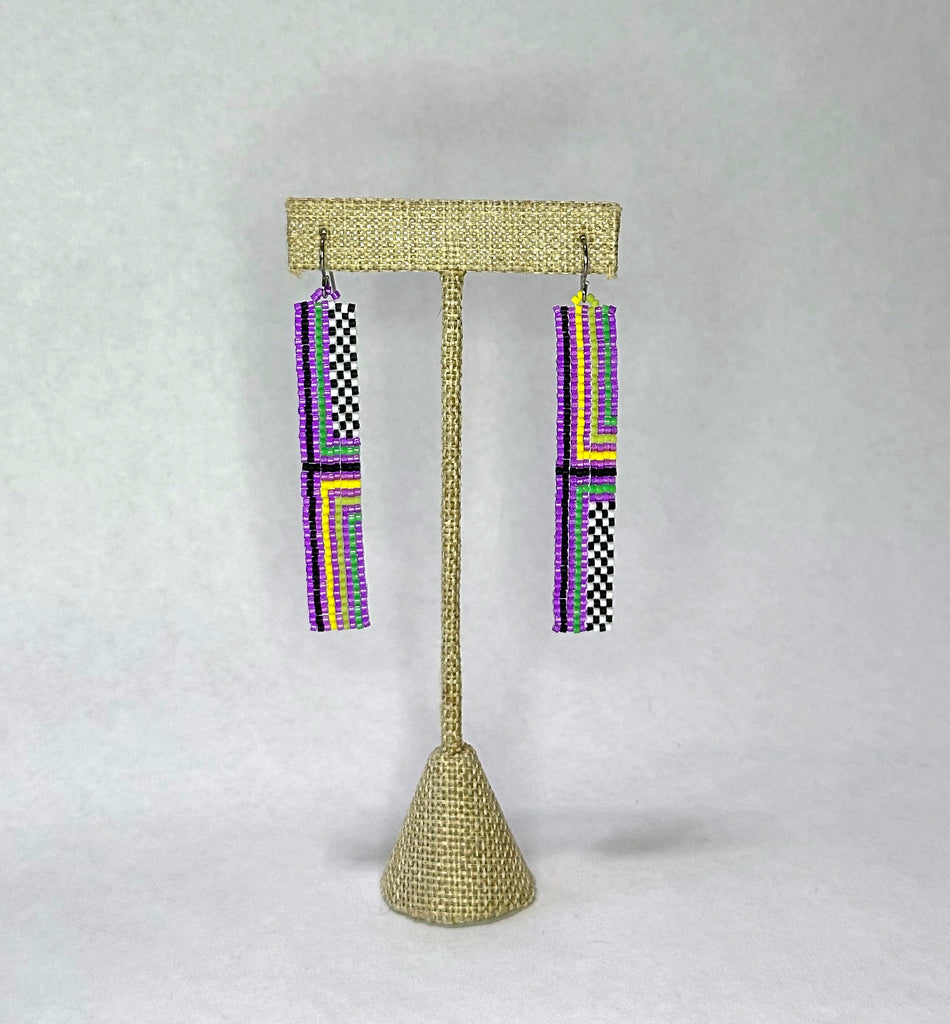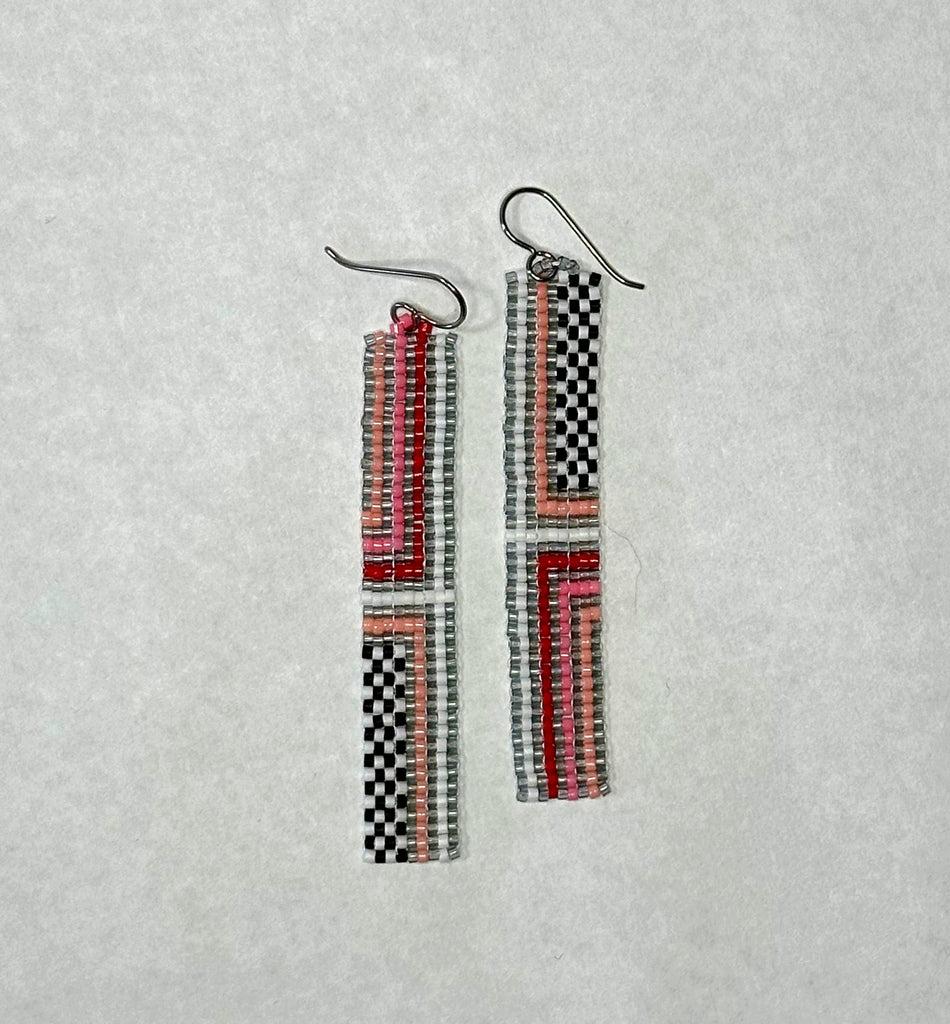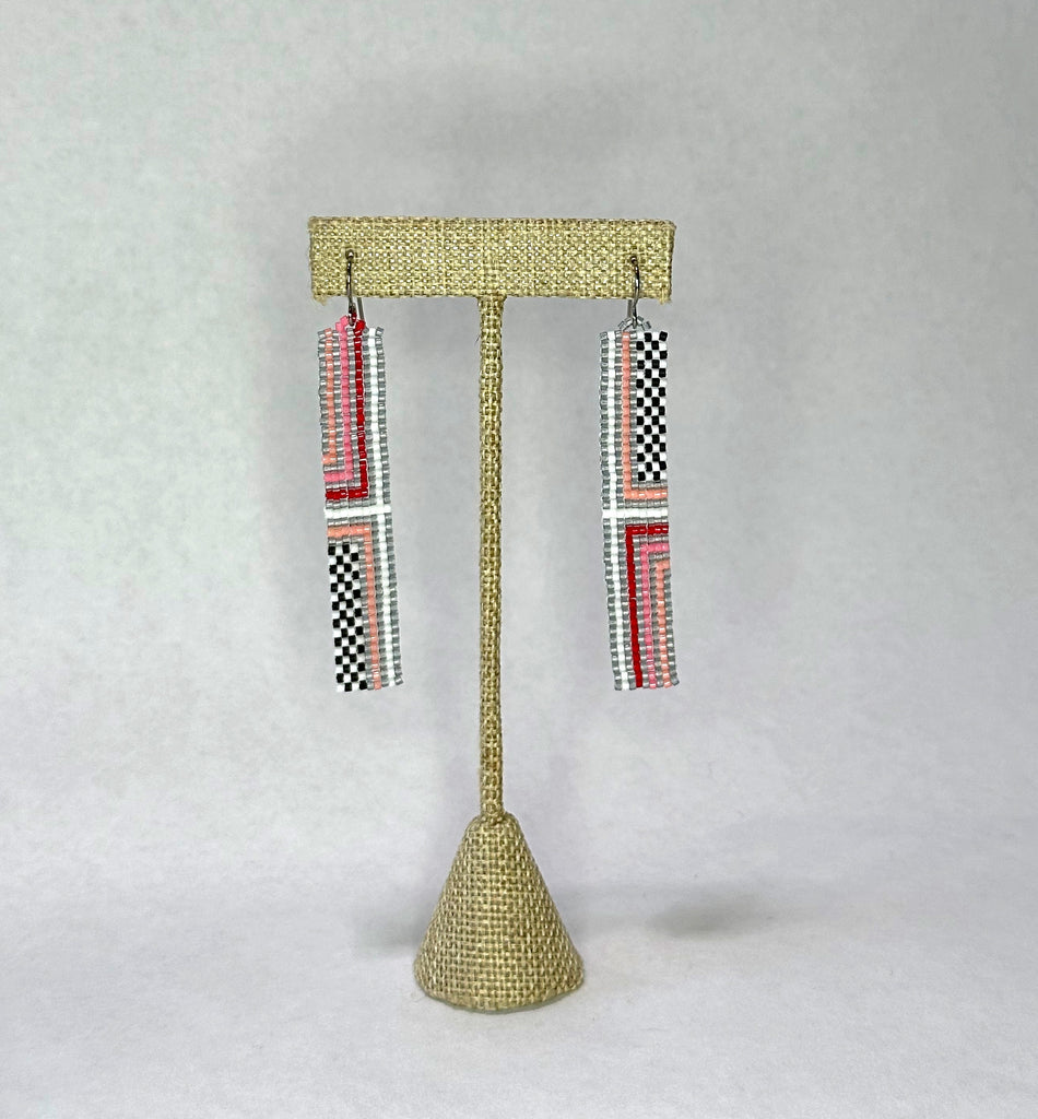 Hand beaded narrow ribbon earrings with stripe and checker pattern. Hypoallergenic ear wires (niobium) are great for sensitive ears. 3.5" total length including the ear wire.  Japanese glass seed beads.