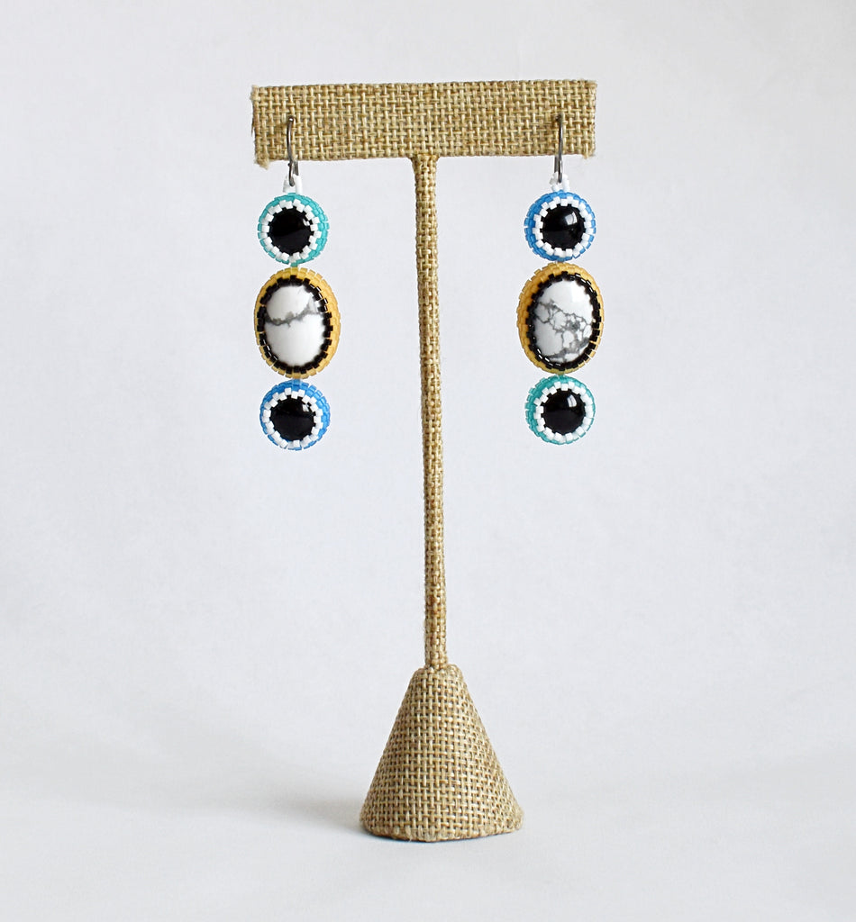 Drop earrings with hand beaded bezels on stones. Onyx and howlite stones are surrounded by blue, soft yellow, teal, black and white glass seed beads. 2.75" total length including ear wires. Ear wires are hypoallergenic (niobium) and great for sensitive ears.
