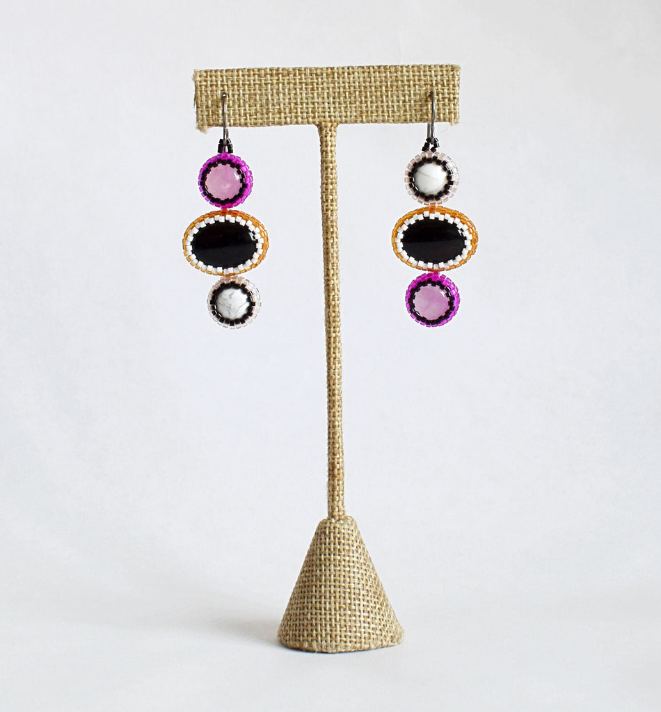 Drop earrings with hand beaded bezels on stones. Onyx, howlite and rose quartz stones are surrounded by bright magenta, sparkly soft pink and root beer, black and white glass seed beads. 2.25" total length including ear wires. Ear wires are hypoallergenic (niobium) and great for sensitive ears.