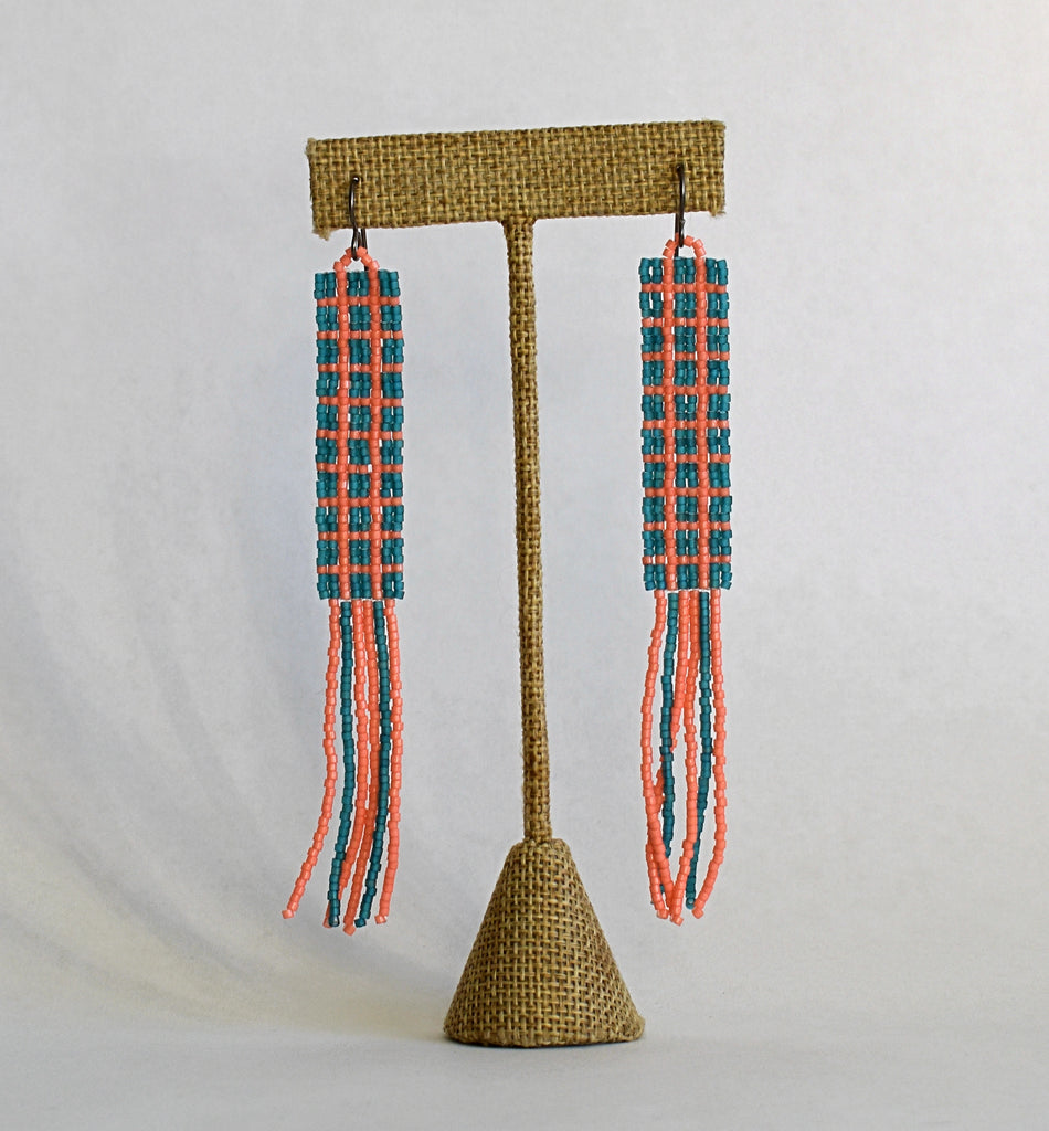 Windowpane patterned fringe beaded earrings on niobium (hypoallergenic) ear wires. Teal and peach pink colored beads. Total length including ear wires is 4.5".