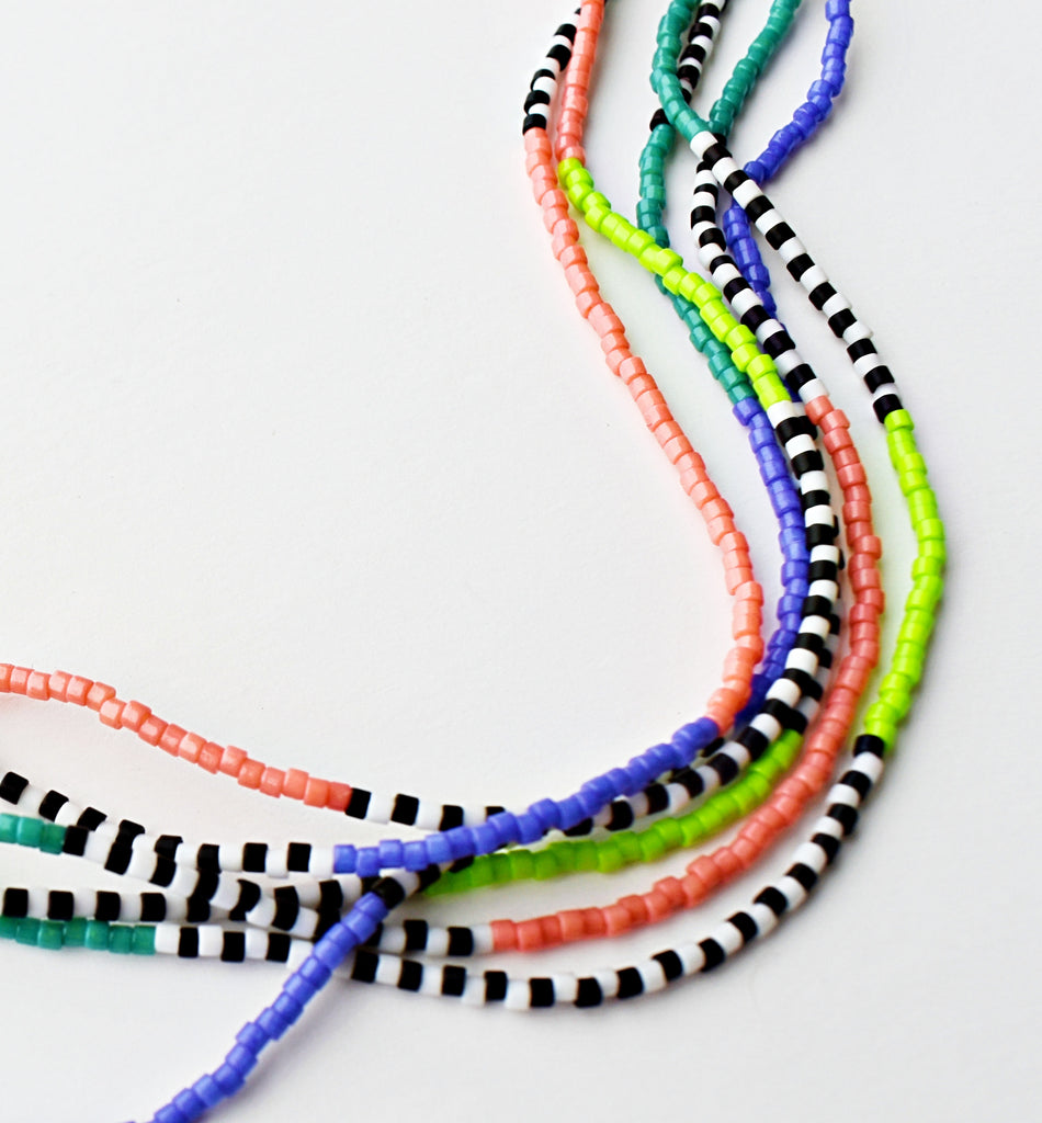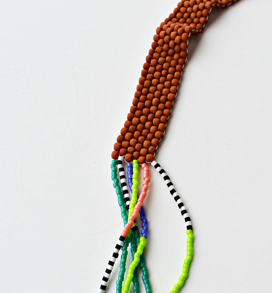 Mix it up with size and texture. This necklace features half in a solid flat stitch with larger beads and the other half in six strands of striped patterned tiny beads. Features brown, neon green, pink, black, white, turquoise and purple colored beads. 24" long without a clasp.