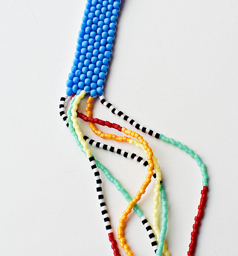 Mix it up with size and texture. This necklace features half in a solid flat stitch with larger beads and the other half in six strands of striped patterned tiny beads. Features light blue, light aqua, mango, black, white, butter yellow and red colored beads. 24" long without a clasp.