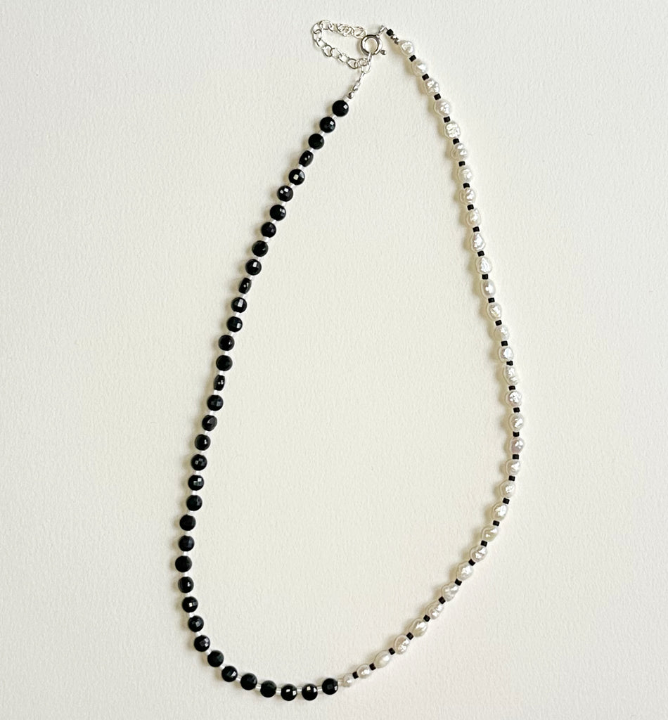 Onyx: Pearls with faceted flat round onyx beads and black and white seed beads