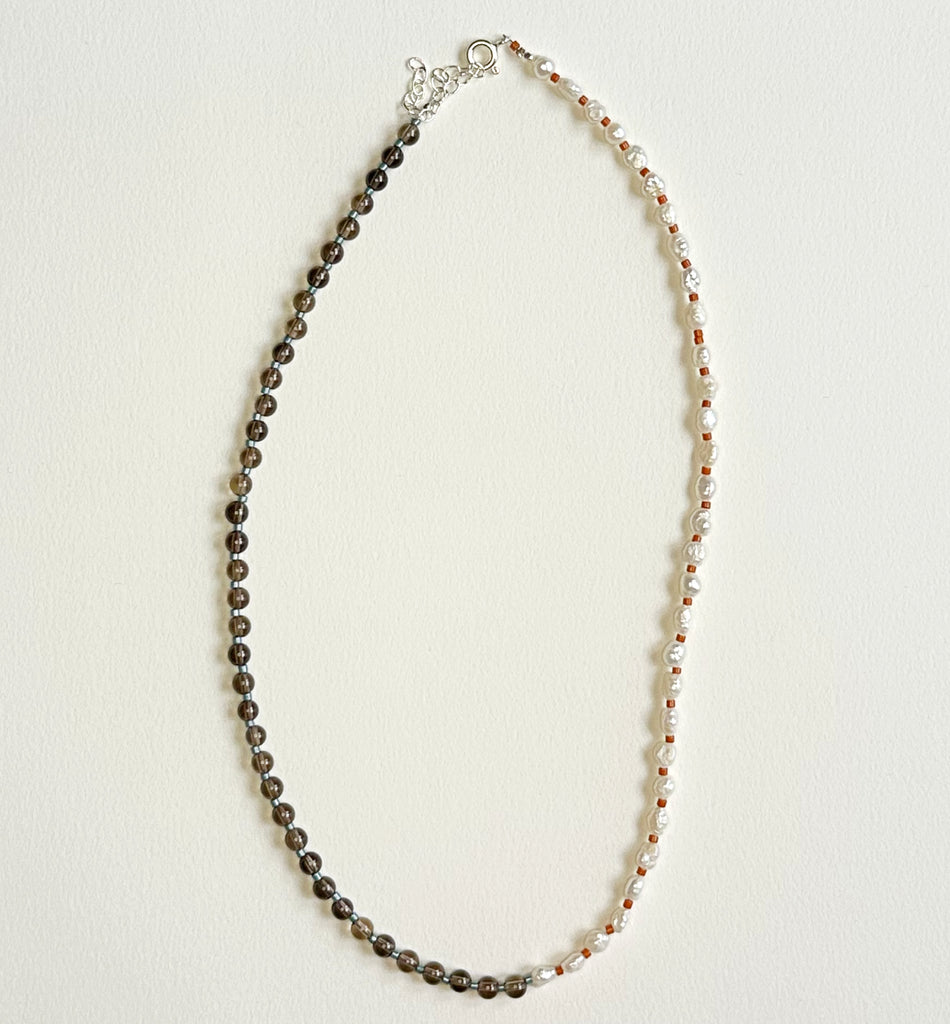 Smoky Quartz: Pearls with round smoky quartz beads, brown and sea green seed beads