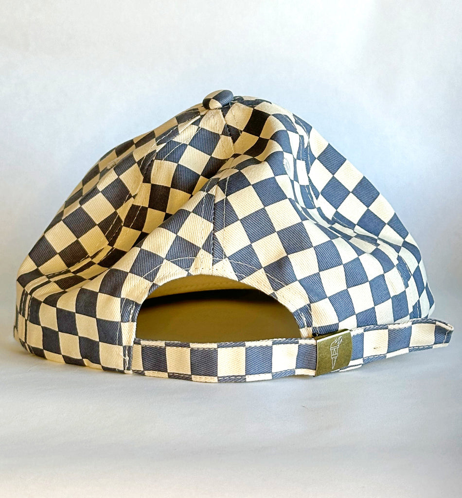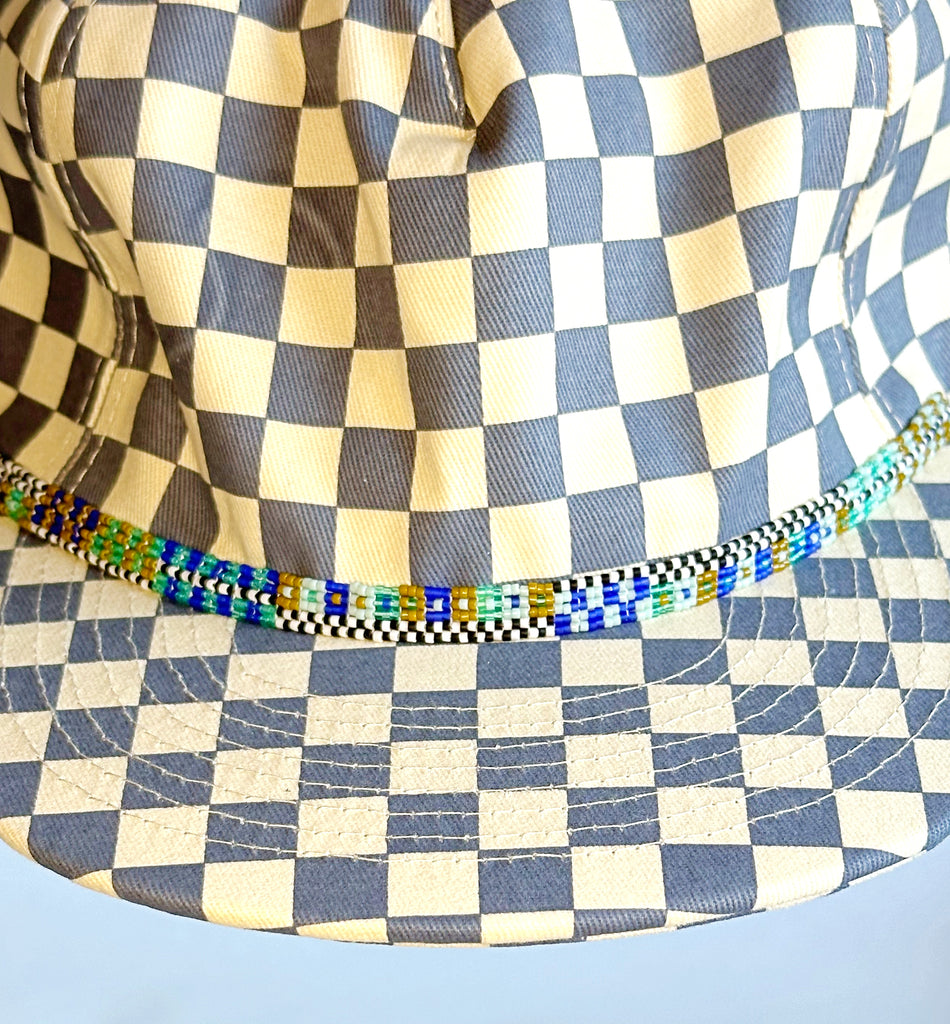 Awesome denim blue and white checkerboard flat brim hat blank personalized with a hand beaded front band. Adjustable back band. 100% cotton hat.
