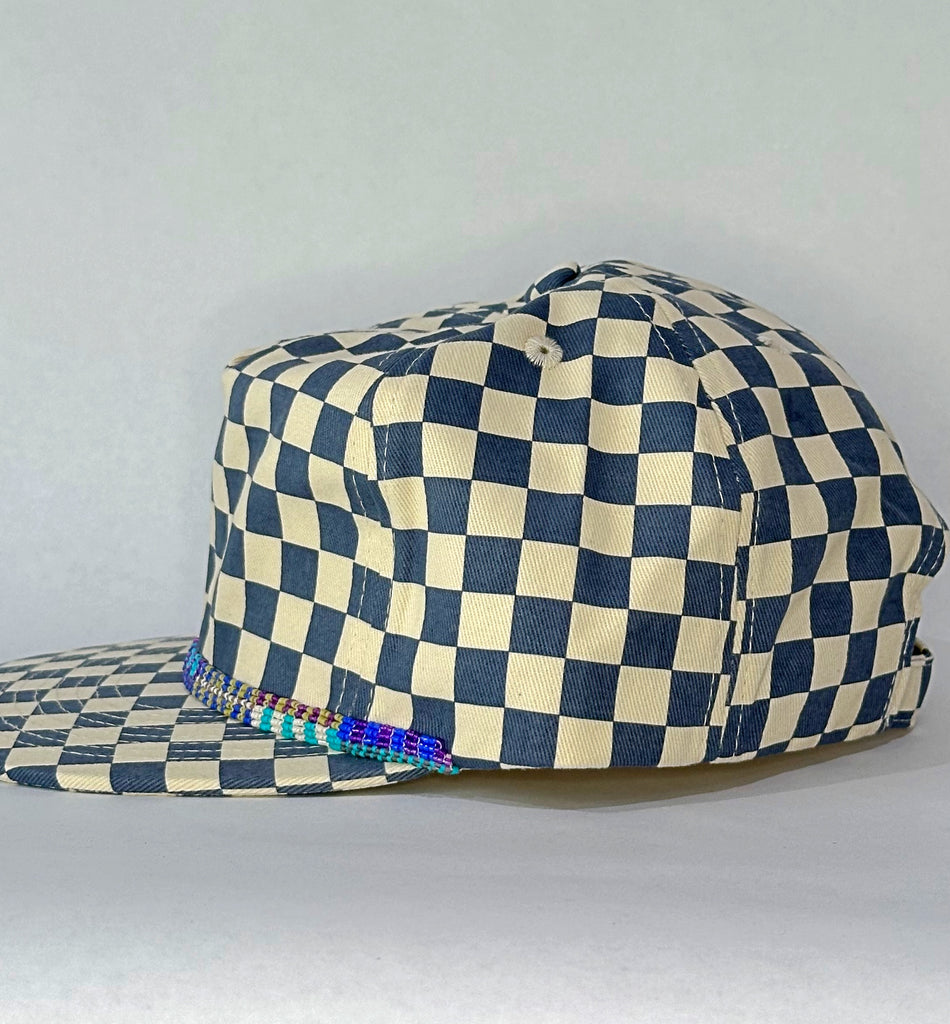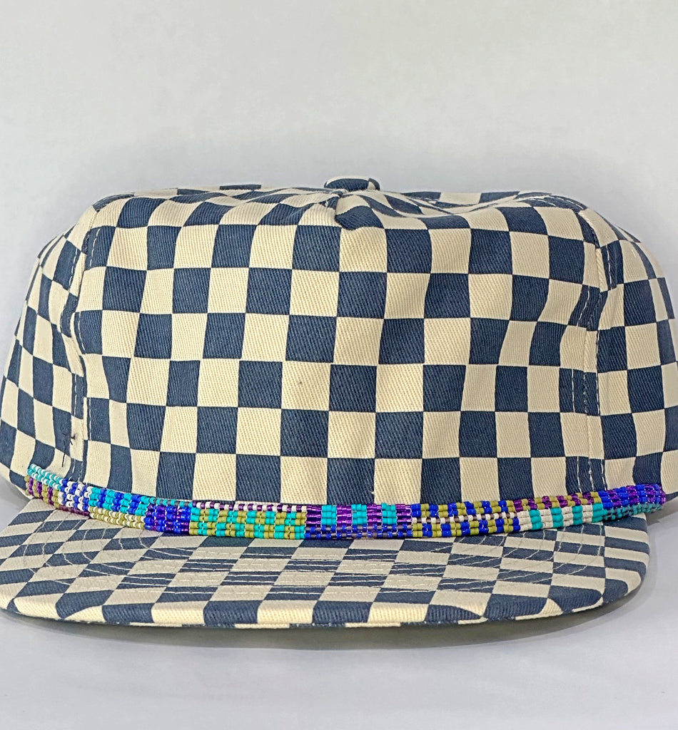 Awesome blue and white checkerboard printed flat brim hat blank personalized with a hand beaded band. Adjustable strap back. 100% cotton hat.