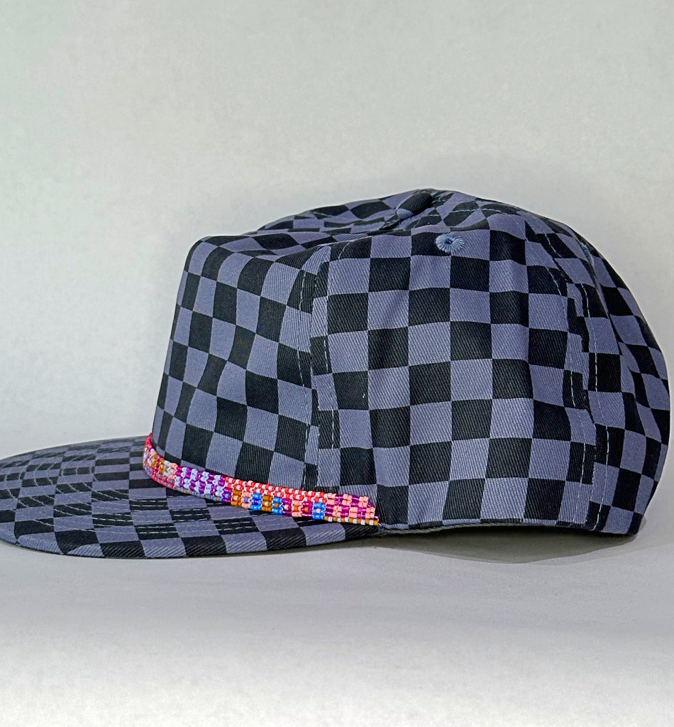 Awesome tonal blue checkerboard printed flat brim hat blank personalized with a hand beaded band. Adjustable snapback. 100% cotton hat.