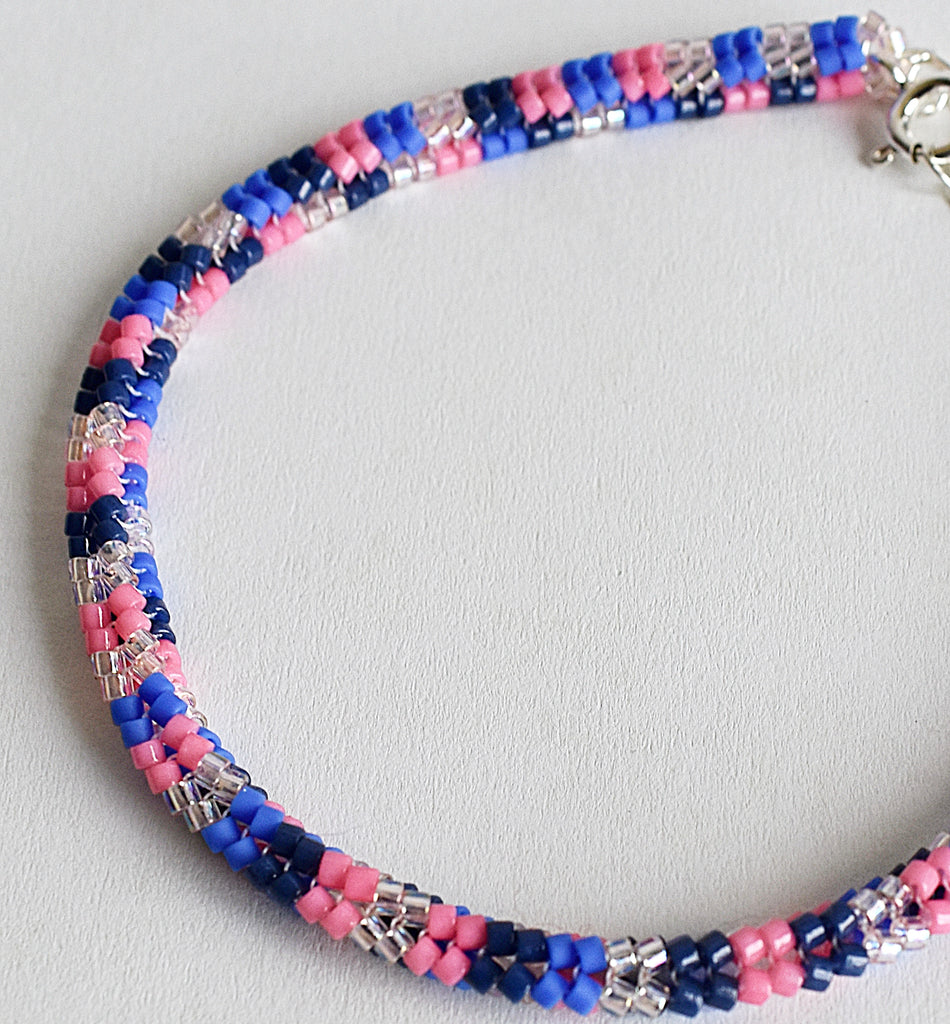 Beaded rope bracelet in checkerboard pattern with adjustable sterling silver chain and sterling silver spring ring clasp. Transparent light pink with opaque blue, navy and pink colored Japanese seed beads. 6.5" in length with 1.5" chain adjuster.