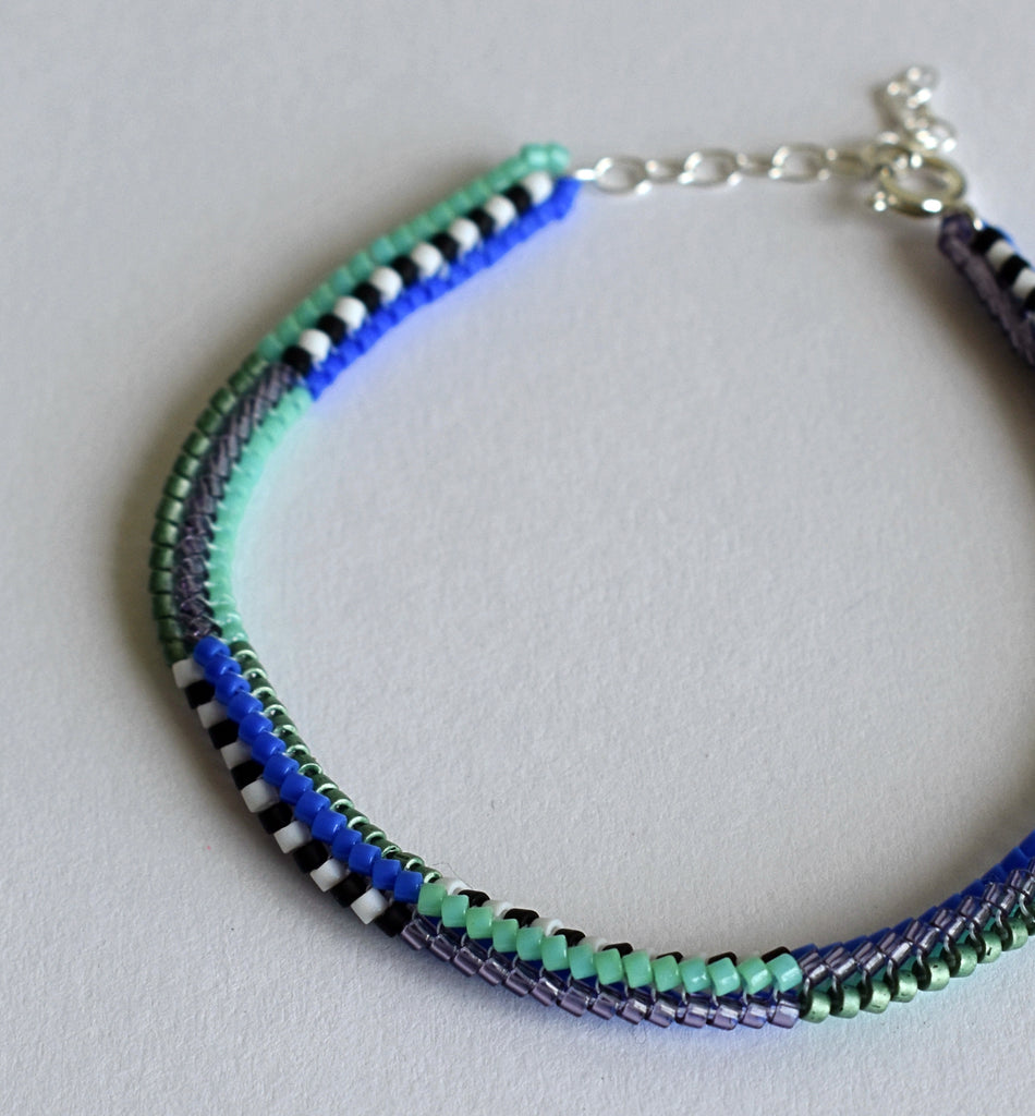 Beaded rope bracelet in mixed stripe pattern with adjustable sterling silver chain and sterling silver spring ring clasp. Aqua, blue, purple, metallic teal, black, and white colored beads. 6" in length with 1.5" chain adjuster.