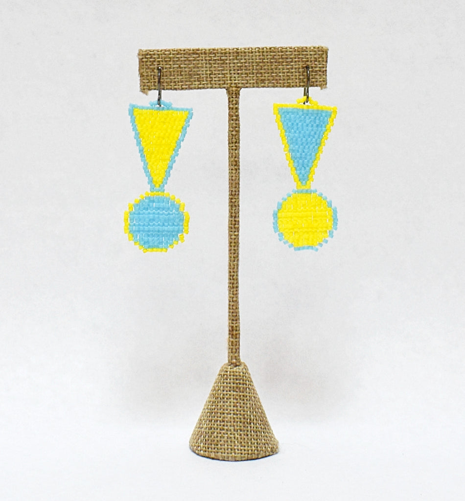 Beaded earrings in square and triangle shapes on niobium (hypoallergenic) ear wires. Sky blue and yellow colored beads. Total length including ear wires is 2". Check out all the fun color variations and don't hesitate to reach out if you'd like a custom colorway.