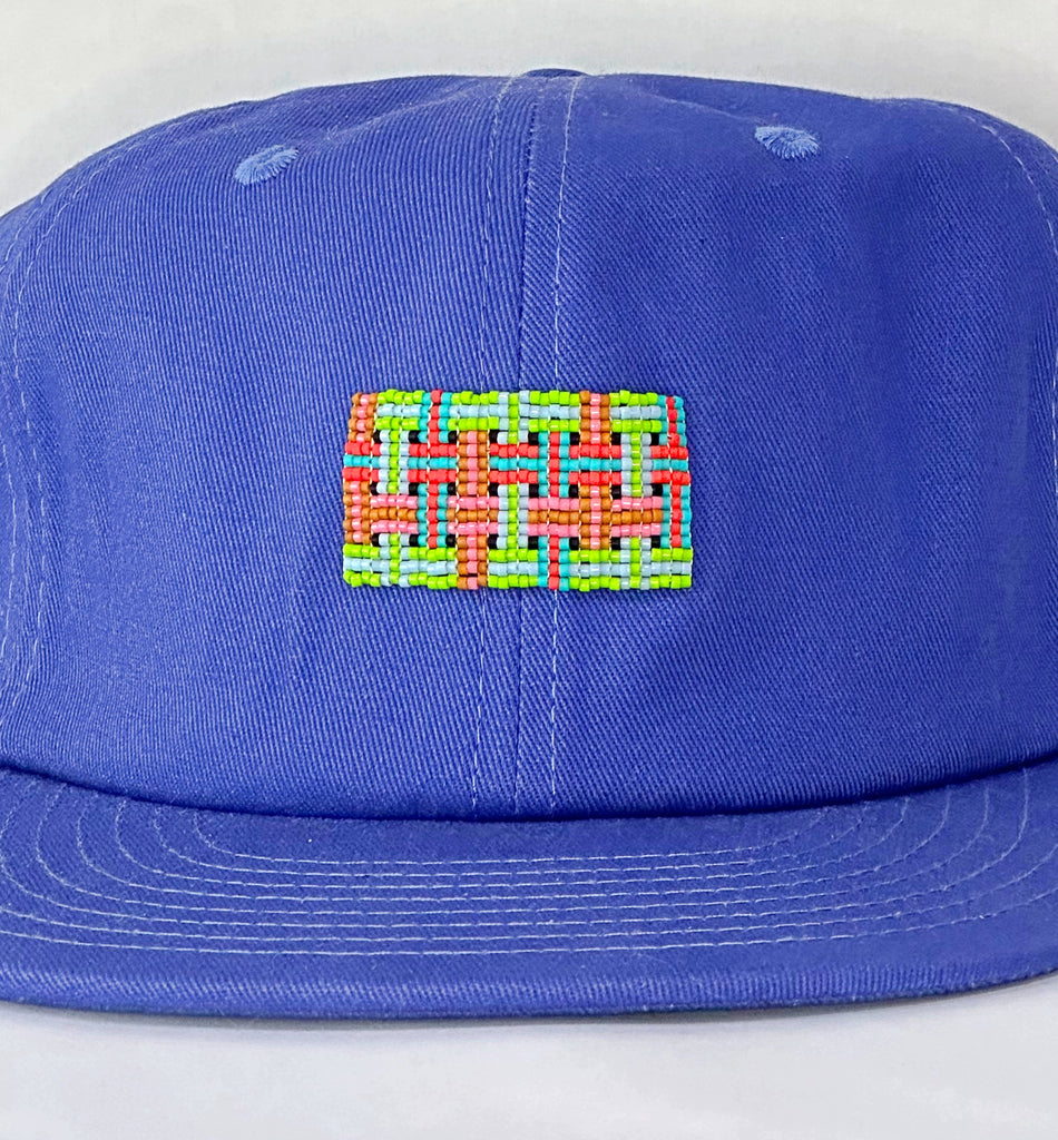 Royal blue cotton flat brim hat blank personalized with a hand beaded weave pattern patch. Adjustable back band. 100% cotton hat.