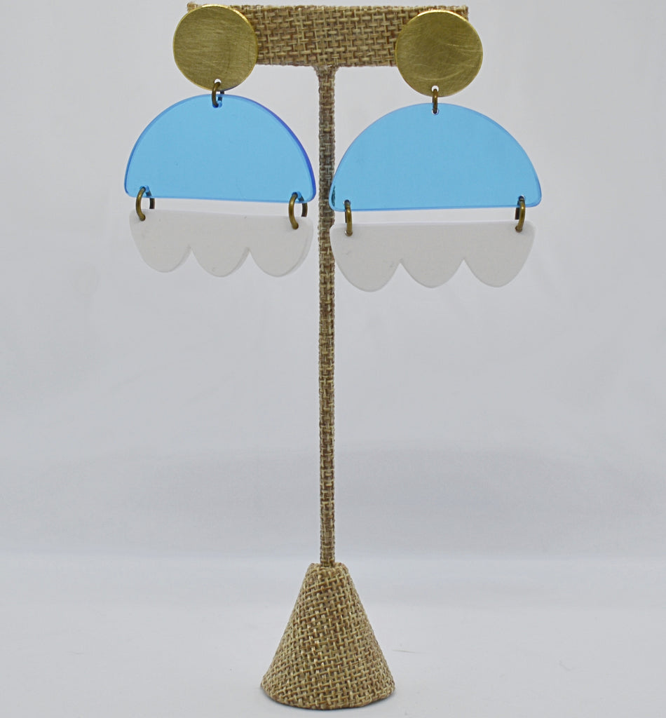 Fun and bright geometric earrings play with color and transparency. Brushed brass and acrylic with sterling silver ear posts. 2" wide x 2.5" long.