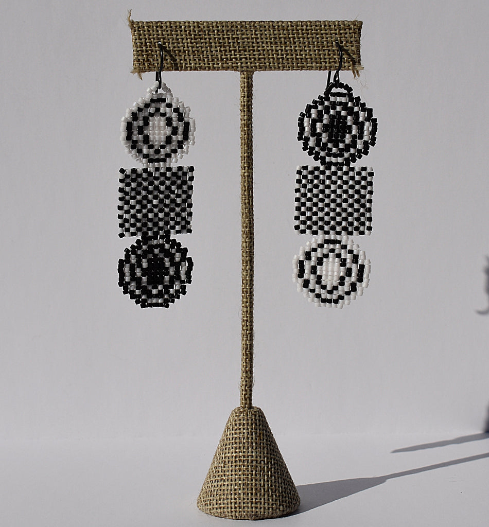 Stacked circle and square shapes beaded earrings on niobium (hypoallergenic) ear wires. Black and white colored beads. Total length including ear wires is 3".
