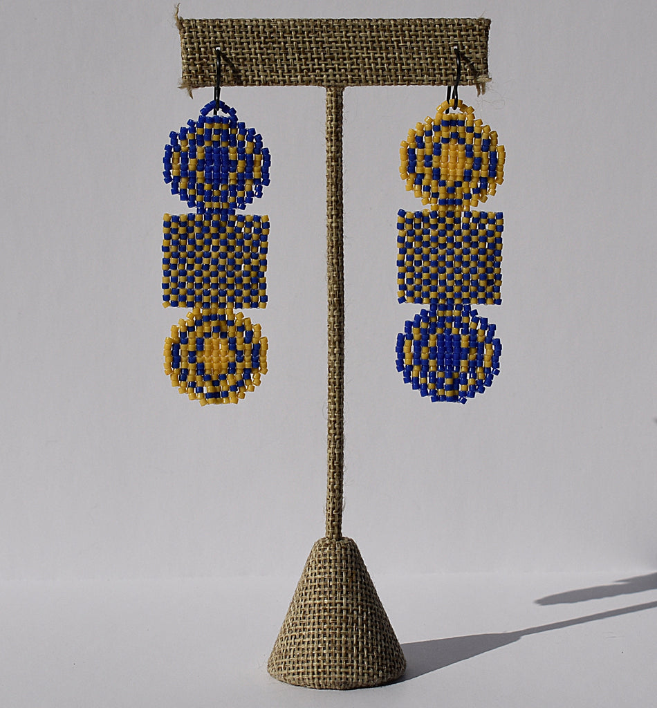 Stacked circle and square shapes beaded earrings on niobium (hypoallergenic) ear wires. Blue and yellow colored beads. Total length including ear wires is 3".